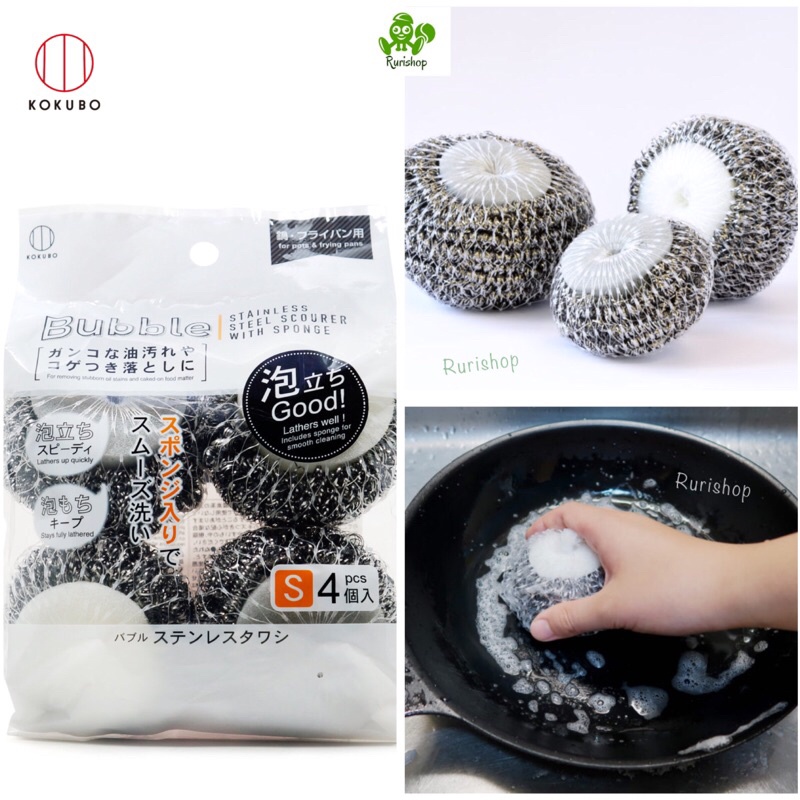 Giới thiệu Set 4 miếng mút inox cọ rửa chảo xoong nồi KOKUBO Nhật Bản (mẫu mới) bằng sợi thép không gỉ, được bọc lưới kèm bọt biển