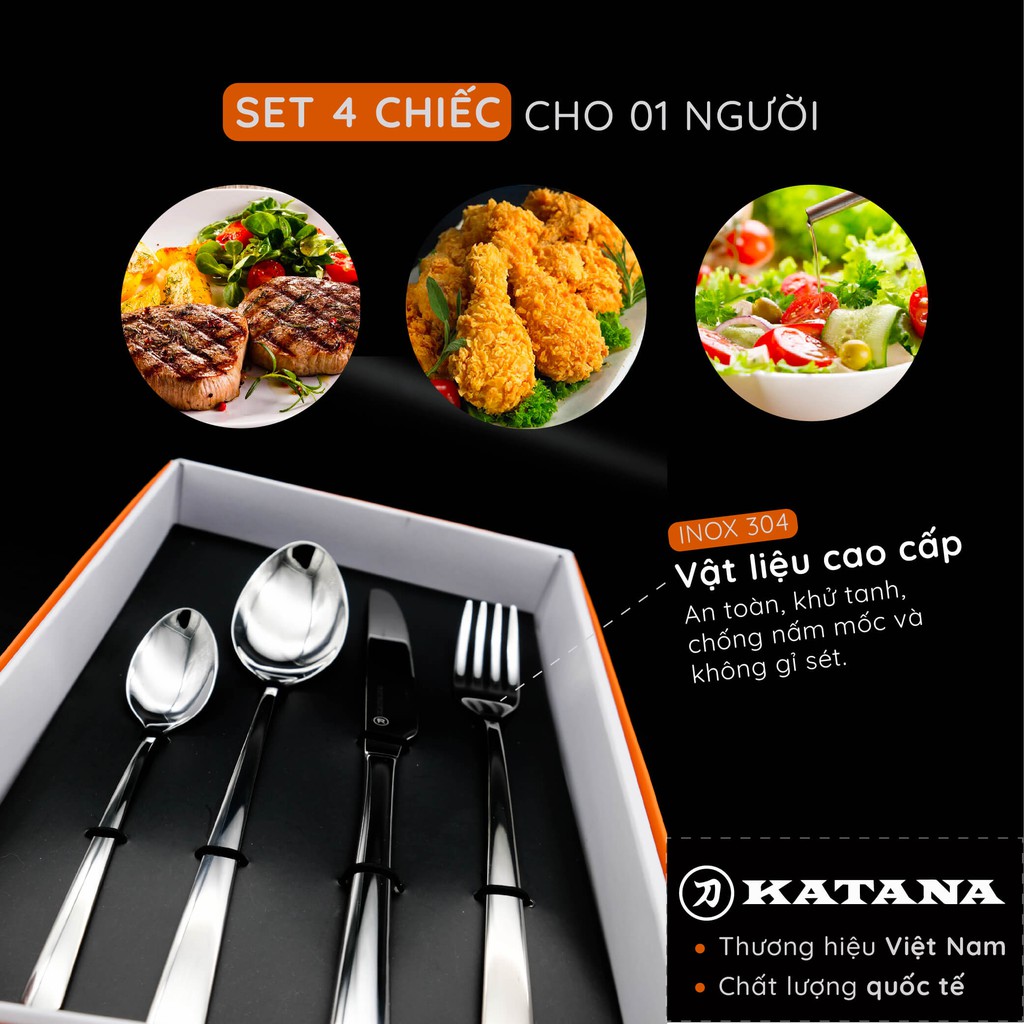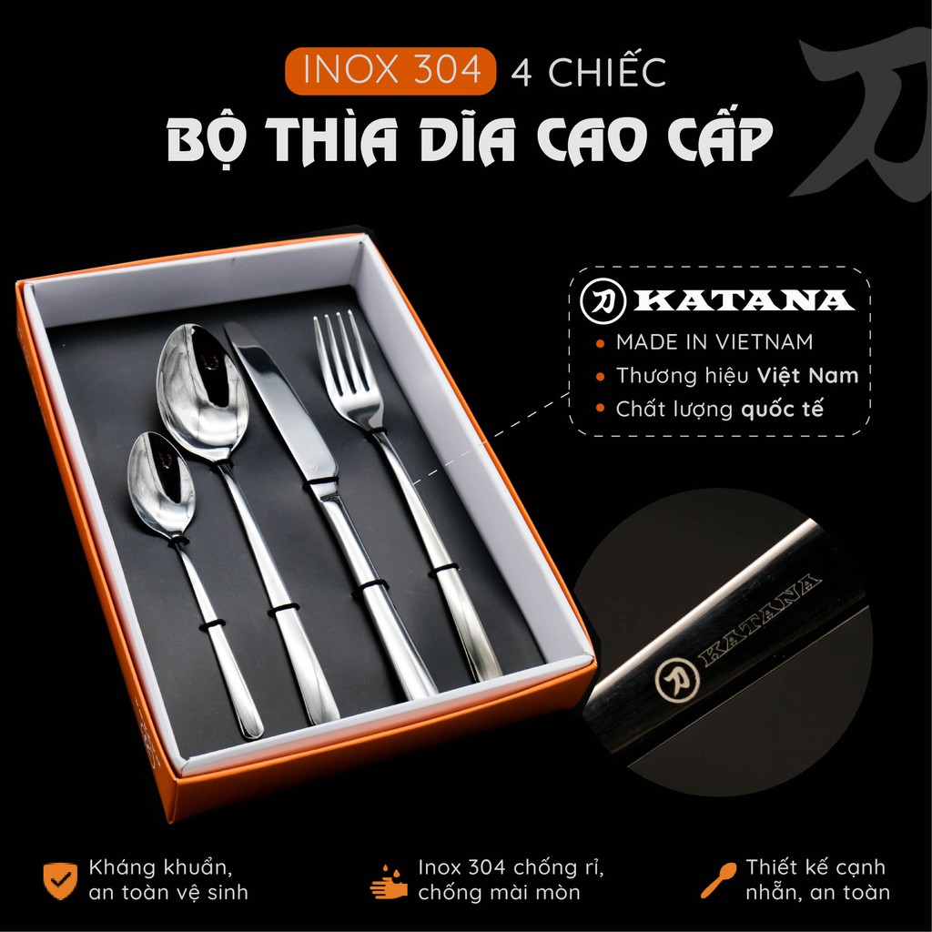 Nhà cửa & Đời sống > Bộ đồ bàn ăn > Bộ dao kéo || Set 4 món dao, thìa, dĩa bàn ăn KATANA INOX 304 vân trơn sáng bóng cao cấp, sang trọng - KATA100Còn hàng