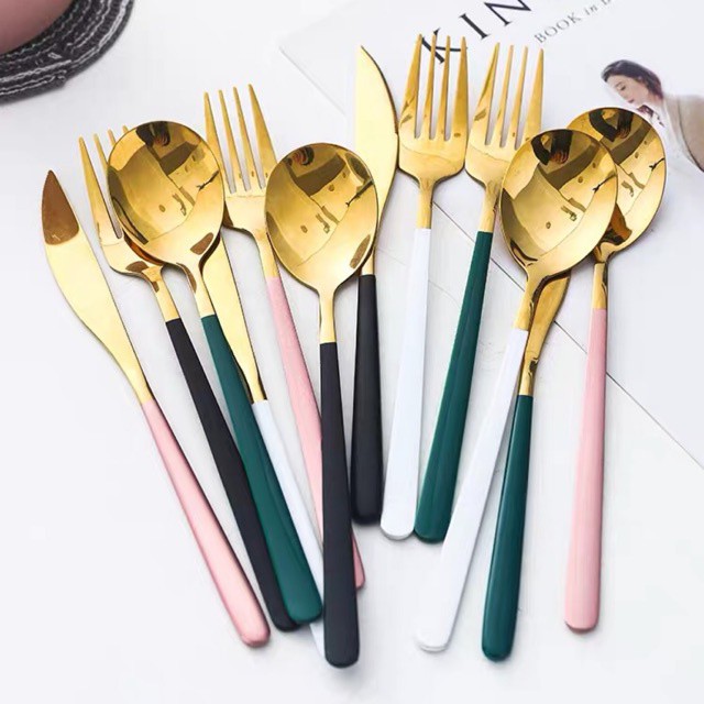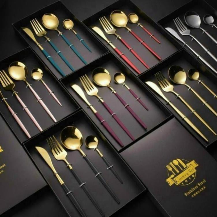 Nhà cửa & Đời sống > Bộ đồ bàn ăn > Bộ dao kéo || Set 4 món dụng cụ bàn ăn cẩm thạch mạ vàng - Dao + Dĩa + Thìa lớn + Thìa nhỏCòn hàng