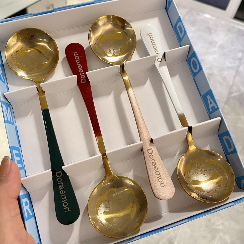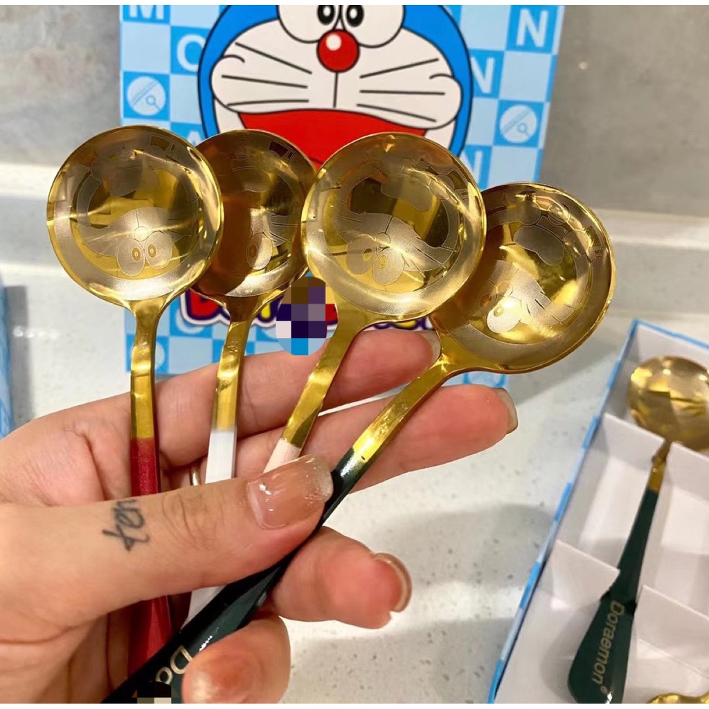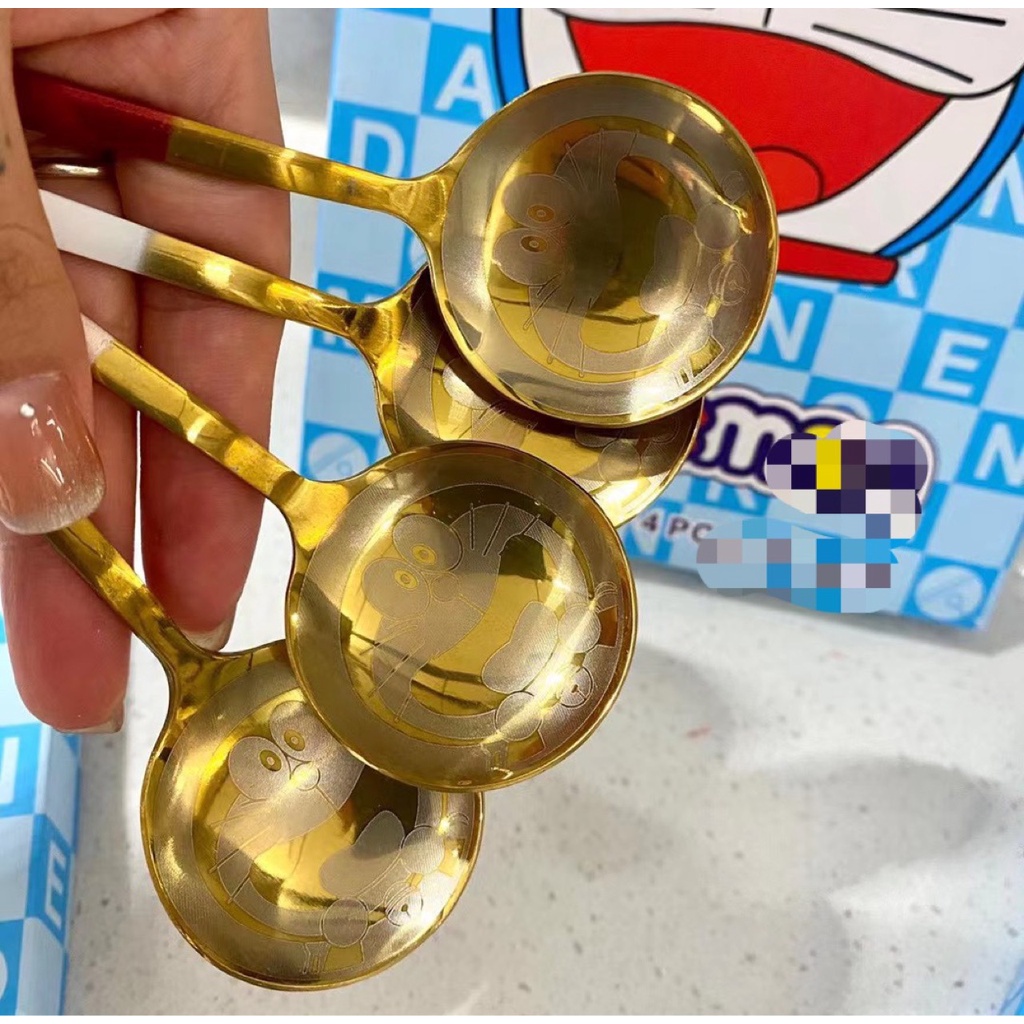 Nhà cửa & Đời sống > Bộ đồ bàn ăn > Dĩa || Set 4 muỗng Doremon inox mạ vàng kèm vỏ hộp xinh xắn bộ thìa inox mạ vàng khắc hình Doremon đáng yêuCòn hàng