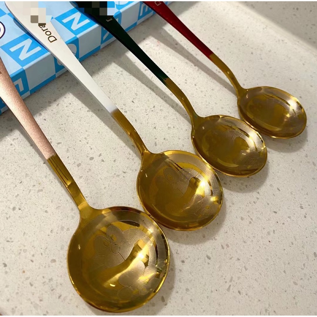 Tên sản phẩm: Set 4 Thìa Inox Mạ Vàng Khắc Hình Doraemon Đáng YêuChất liệu: Inox cao cấp