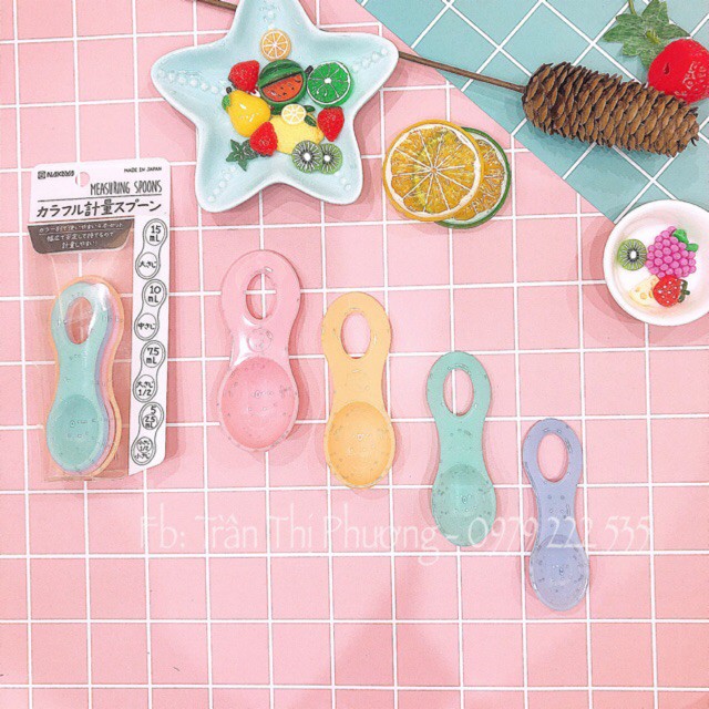 - Thìa có 4 màu: cam, hồng, tím, xanh tương đương với mỗi thể tích.