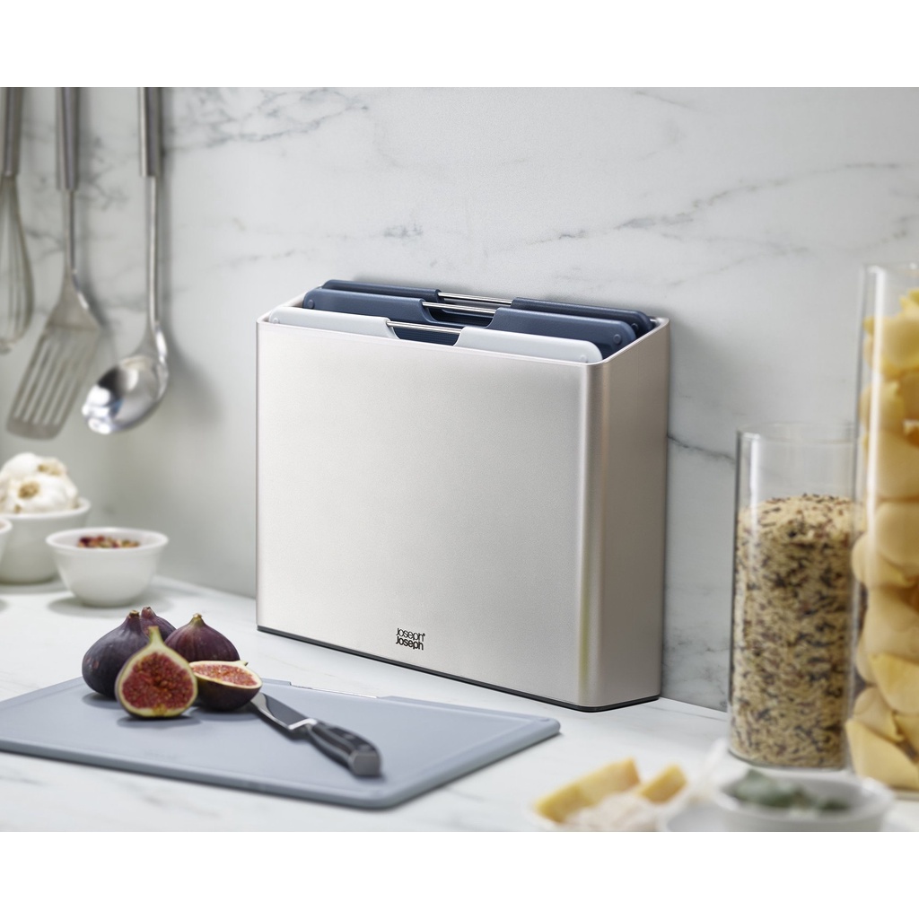 - Sự tinh tế của nhà sản xuất còn được thể hiện qua việc thiết kế hộp đựng bộ thớt – bộ 4 thớt Joseph 60184 Folio từ thép không gỉ với thanh cầm cùng chất liệu.