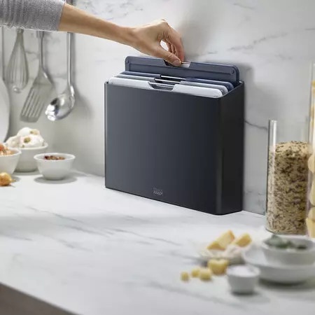 - Bộ thớt Joseph Joseph Folio bao gồm bốn chiếc thớt có màu sắc khác nhau. Cùng với một hộp đựng bằng thép không gỉ thông minh, để cất giữ chúng.