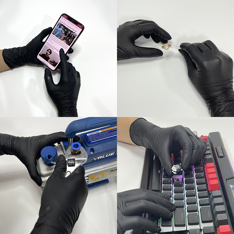 - Black Nitrile có khả năng chịu đựng cao gấp ba lần so với latex và đàn hồi hơn nhựa vinyl, giữ chống rách tốt hơn găng tay tổng hợp khác. Găng tay chống trượt tốt khi sử dụng với các dụng cụ cầm tay như kéo, ống tiêm…là sự lựa chọn hoàn hảo cho các kỹ thuật viên y tế, nghệ sĩ xăm mình, barber, thợ cắt tóc.