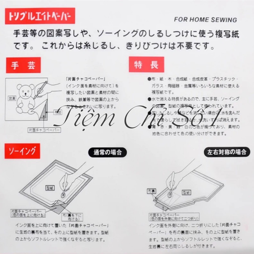 Set giấy than chuyên dụng gồm 5 tờ giấy than các màu, dùng để sang mẫu thêu. Giấy than chuyên dụng nên sẽ ko lo bị lem mực như giấy than thông thường, mực sẽ mờ khi bạn ngâm nước. Mọi người nên sử dụng giấy than chuyên dụng thay vì giấy than thông thường vì giấy than thông thường có nguy cơ làm lem và hỏng tác phẩm của mọi ngườiNhanh chóng, tiện lợi, dễ dàng sử dụng tuy nhiên giấy than scan mẫu có nhược điểm là mực in hơi mờ nên sẽ ko phù hợp với các loại vải sần, cứng, dày.