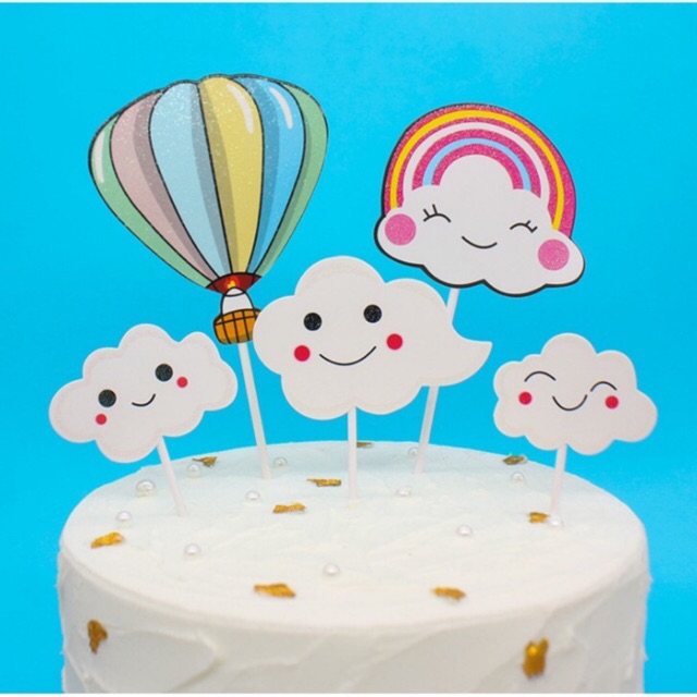 - Gồm 5 chi tiết : hình khinh khí cầu, hình cầu vồng và 3 hình mây dễ thương dùng để trang trí bánh kem, các loại bánh ngọt, cupcake,...