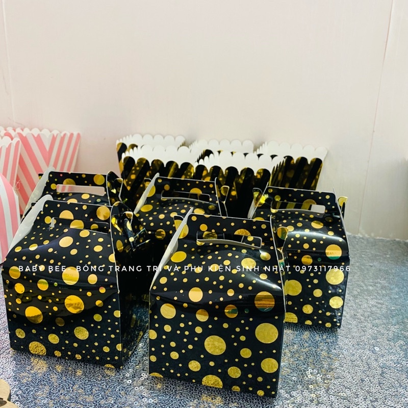 Bộ hộp quà và hộp đựng bắp trang trí bàn tiệc bao gồm:+ 5 Hộp quà và 5 Hộp đựng bắp