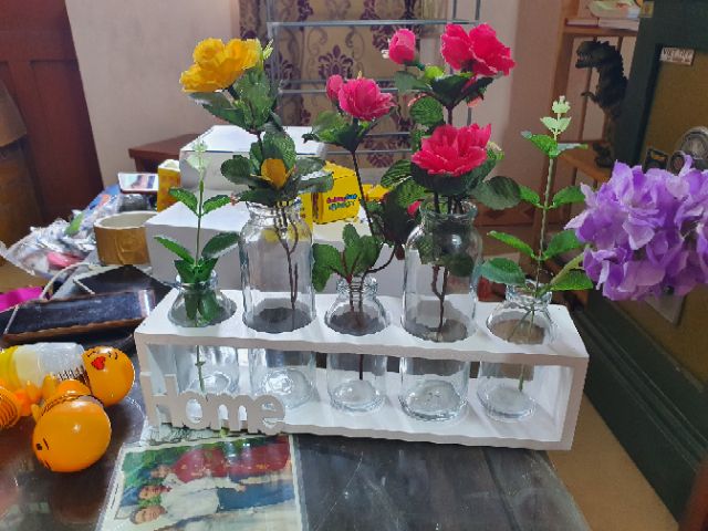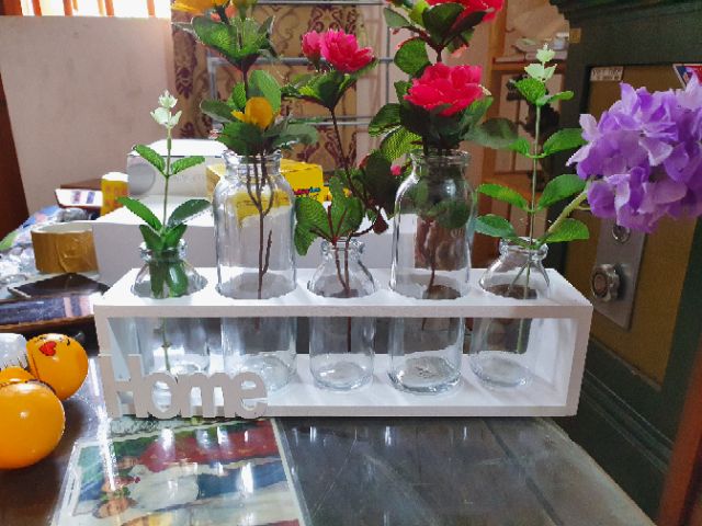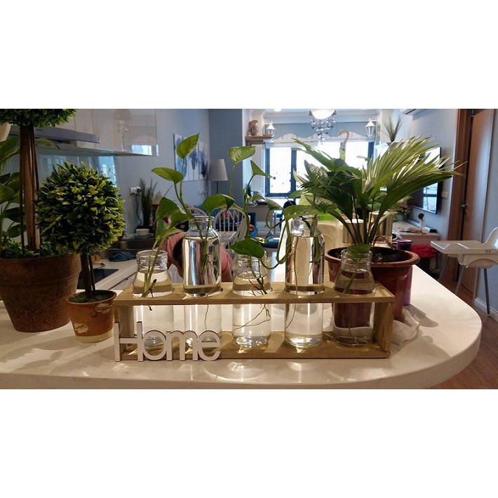 Set kệ và bình thủy tinh cắm hoa trồng cây nghệ thuật HOME SWEET HOME!Dành cho các anh chị em thích trang trí nhà, hoặc trang trí góc làm việc. Set kệ và bình thủy tinh trong suốt tuyệt đẹp này sẽ mang lại không gian nhẹ nhàng thư giãn cho căn phòng.Tha hồ cắm các kiểu, có thể cắm mỗi lọ 1 loài hoa mà mình yêu thích.