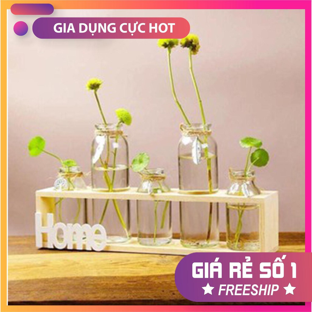 Nhà cửa & Đời sống > Trang trí nhà cửa > Bình trang trí || Sét 5 lọ hoa thuỷ tinh kèm kệ gỗCòn hàng
