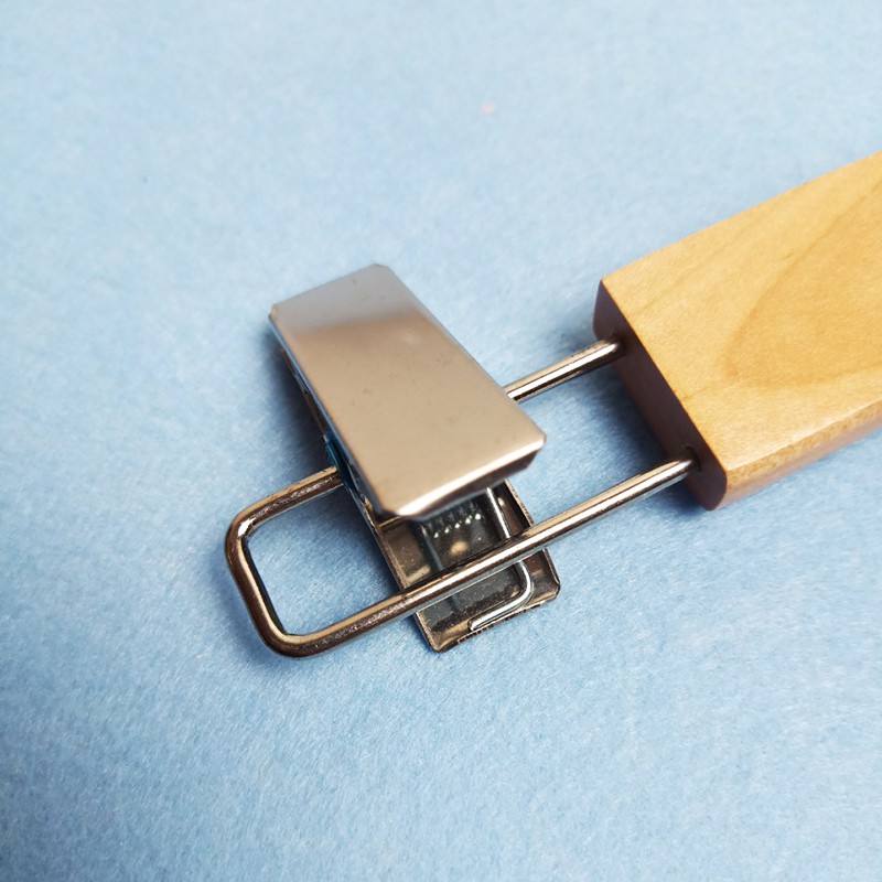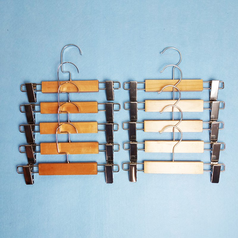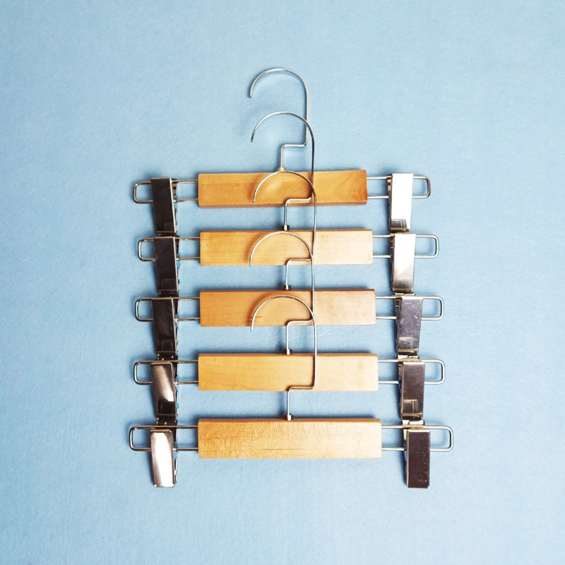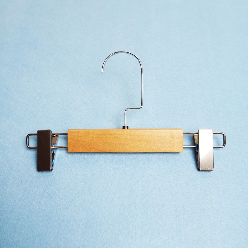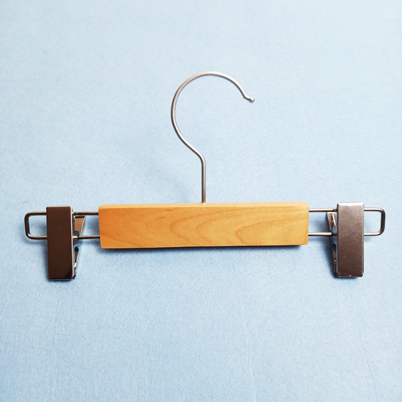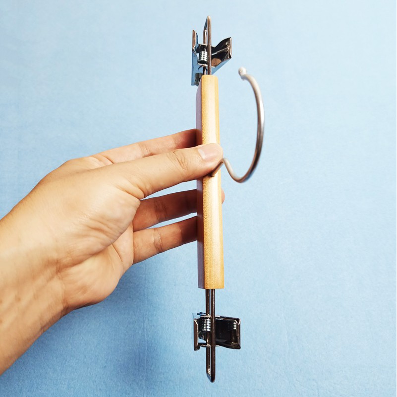 - Mô tả: Sản phẩm có phần thân bằng gỗ tự nhiên, dày 1.2cm, có 2 đầu kẹp và móc treo bằng inox. 2 kẹp có lót nhựa silicon bên trong giúp tăng ma-xát giúp đồ treo không bị rơi, rách hỏng. Sản phẩm dùng để treo các loại quần và chân váy, chuyên dụng trong các shop quần áo trẻ em hoặc trong các gia đình.