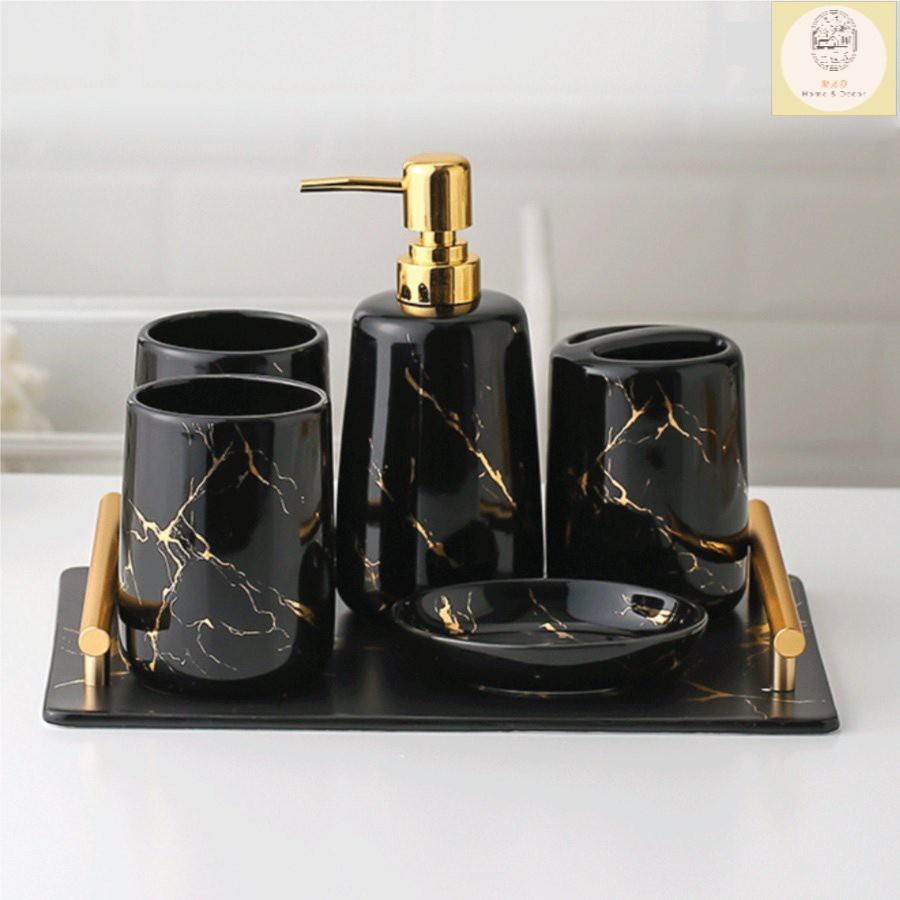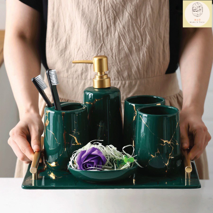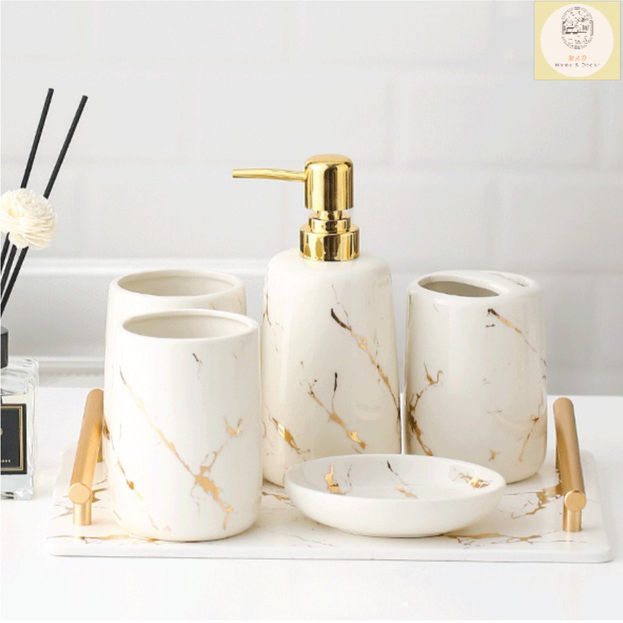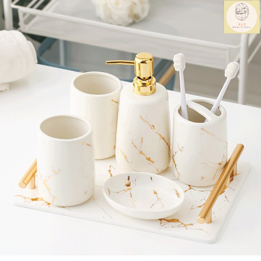 Nhà cửa & Đời sống > Đồ dùng phòng tắm > Kệ đựng bàn chải, kệ nhả kem đánh răng || Set 5 món đồ dùng phòng tắm sứ vân đá cao cấp kèm khay (Hàng xuất Âu)Còn hàng