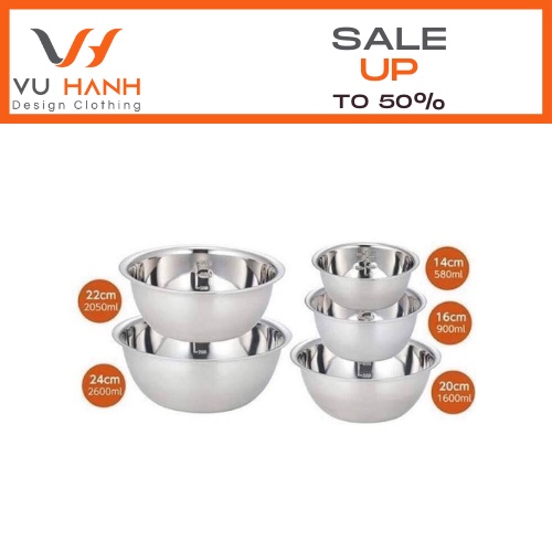 Kích thước: Gồm 5 tô với 5 kích cỡ khác nhau: 1 tô 14cm (dung tích: 580ml), 1 tô 16cm (dung tích: 900ml), 1 tô 20cm (dung tích: 1600ml), 1 tô 22 cm (dung tích: 2050ml), 1 tô 24cm (dung tích: 2600ml)
