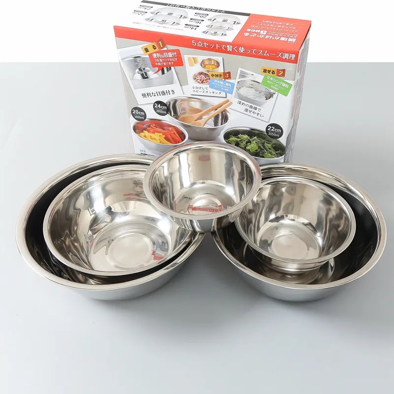 - Set 5 tô inox trộn bột có các mức chia vạch ở mặt trong tô giúp bạn dễ định lượng khi sử dụng để trộn bột, nhồi bột làm bánh.