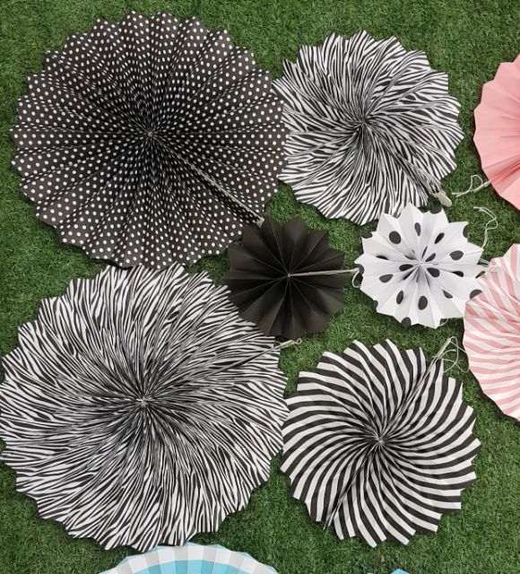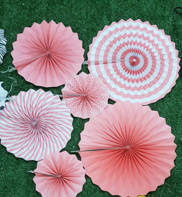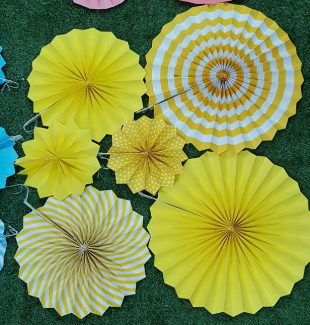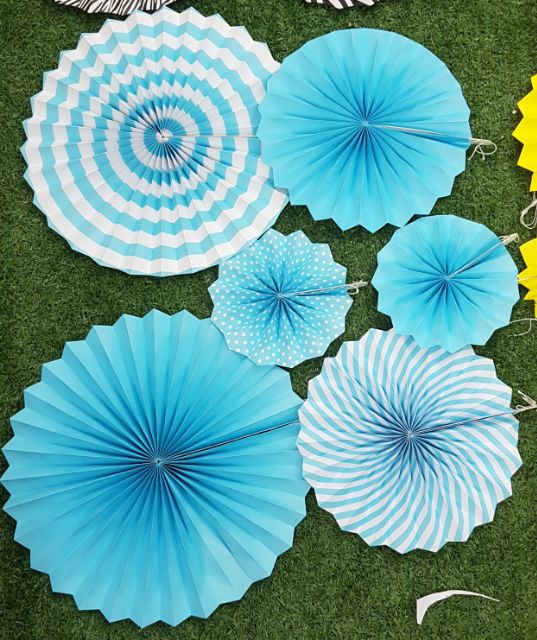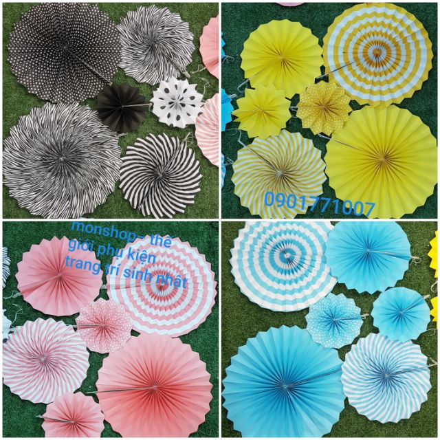 1 set gồm 6 cái quạt giấy có 4 màu xanh, hồng, vàng, đen y ảnh.Set quạt này kết hợp với bóng thì trang trí đẹp lắm nha.