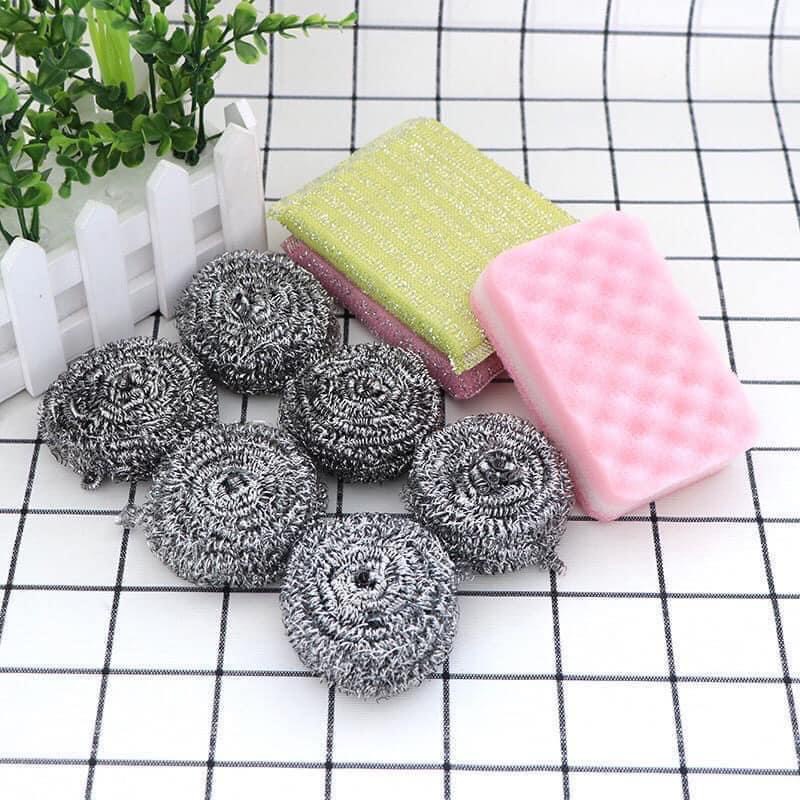 📍 Công Dụng : set gồm 6 miếng, mỗi miếng gồm các sợi inox bao lấy nhau, giúp vừa lau chùi vừa cọ rửa các vết bẩn bám dính trên xoong, nồi đồ dùng nhà bếp