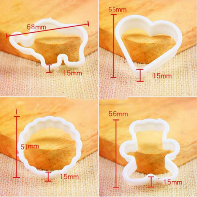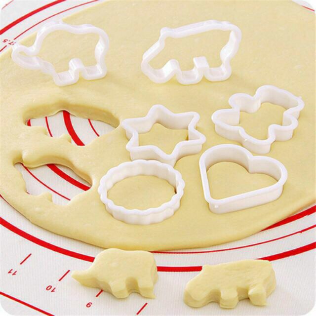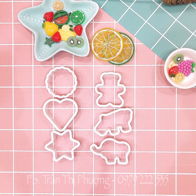 "Set 6 khuôn cắt bánh tạo hình ngộ nghĩnh gồm: tròn hoa. trái tim, sao 6 cánh. gấu, voi, hà mã dễ thươngdùng để cắt bánh, cắt rau củ, tạo hình bánh ...
