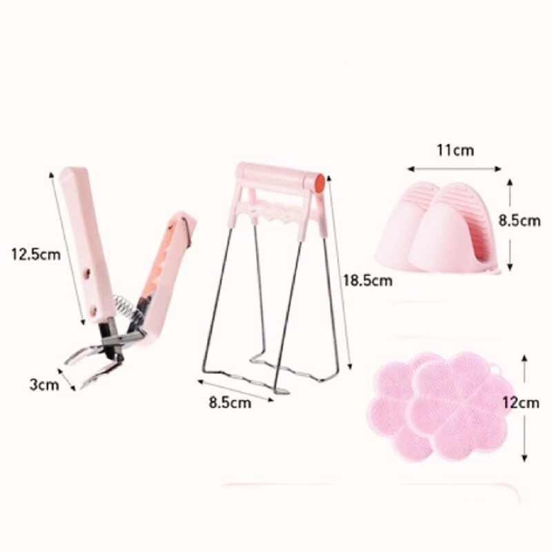 – Bộ sản phẩm bao gồm 6 chi tiết: 1 kẹp gắp đĩa, 1 kẹp nhấc bát, 2 lót tay hình mỏ vịt và 2 miếng rửa bát gai silicone