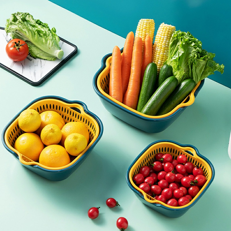 - Kết hợp 2 loại rổ thành một đôi, một chiếc có công dụng để ráo, 1 chiếc để đựng nước, mang lại hiệu quả mỗi khi ngâm, rửa