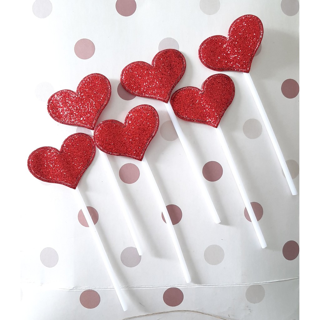 Set 6 topper trái tim trang nhũ kim tuyến trí bánh sinh nhật, bánh kem, bánh cupcake- Kích thước: cao 7cm trái tim dài 3cm