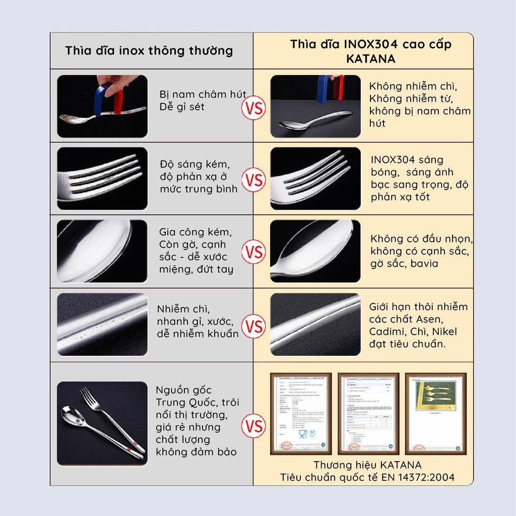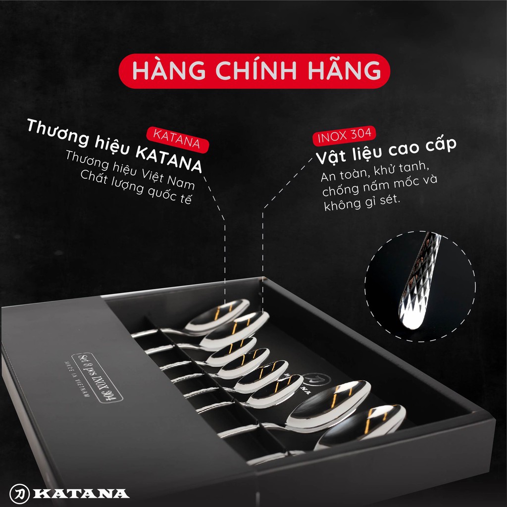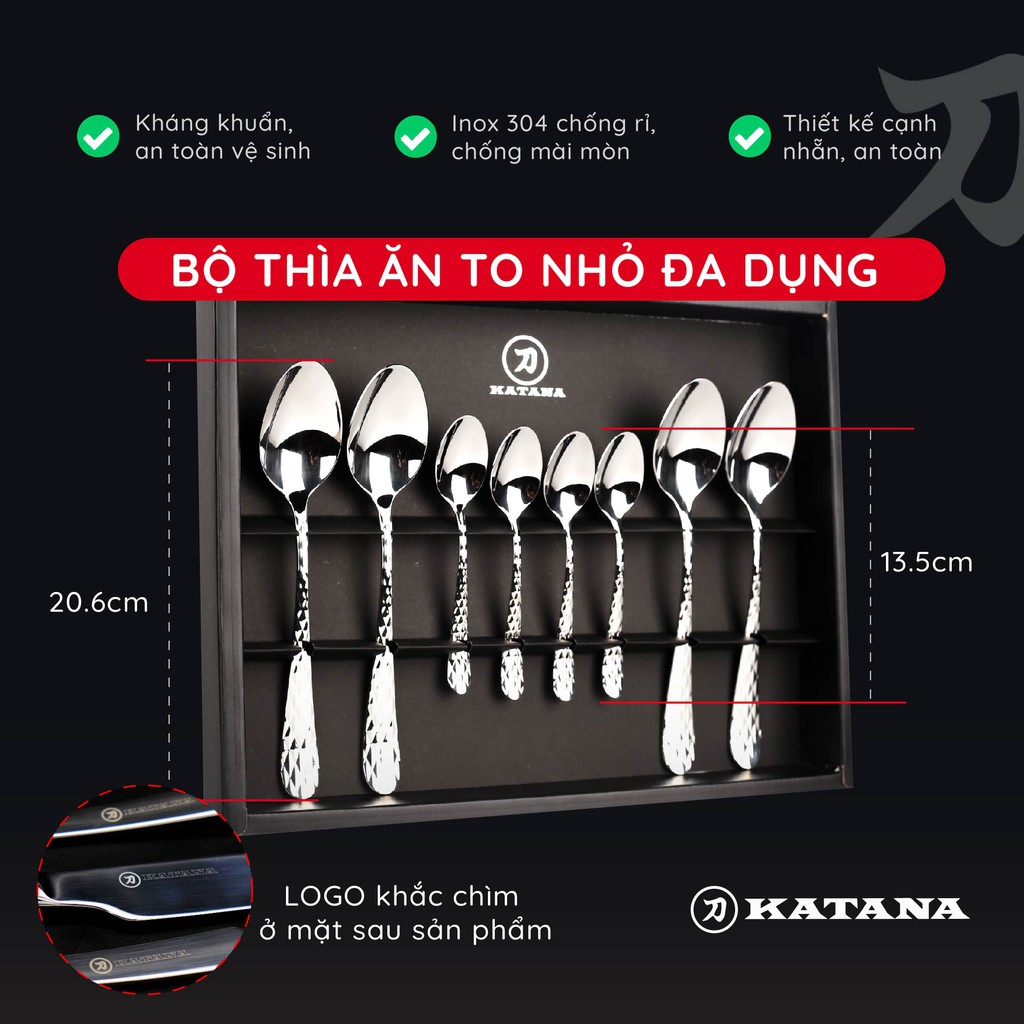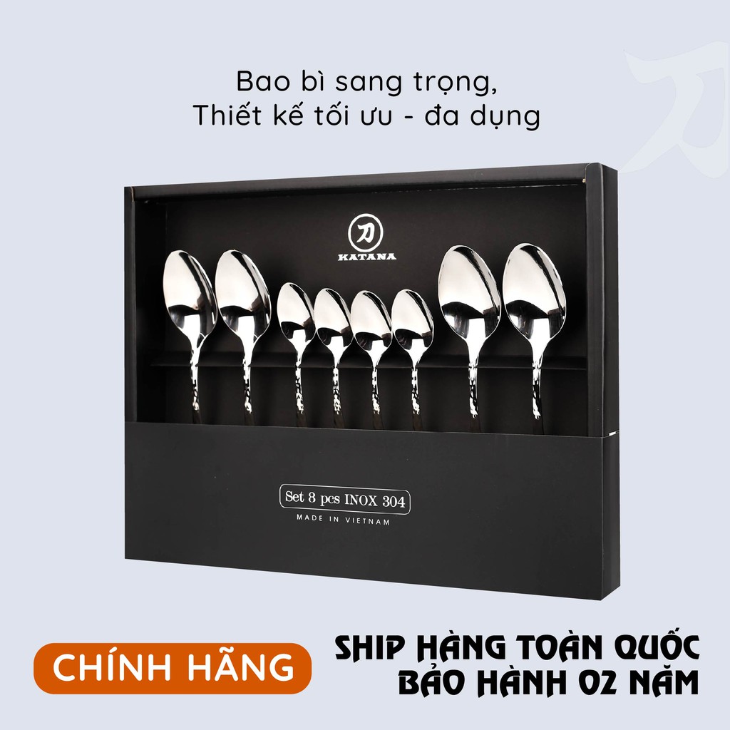 Nhà cửa & Đời sống > Bộ đồ bàn ăn > Bộ dao kéo || Set 8 món bàn ăn cao cấp inox 304 KATANA (4 thìa súp + 4 thìa trà) - vân trám chống bám vân tay VTK385Còn hàng