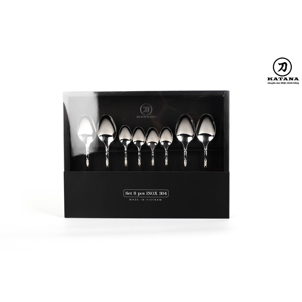 Giới thiệu Set 8 món bàn ăn cao cấp inox 304 KATANA (4 thìa súp + 4 thìa trà) - vân trám chống bám vân tay VTK385