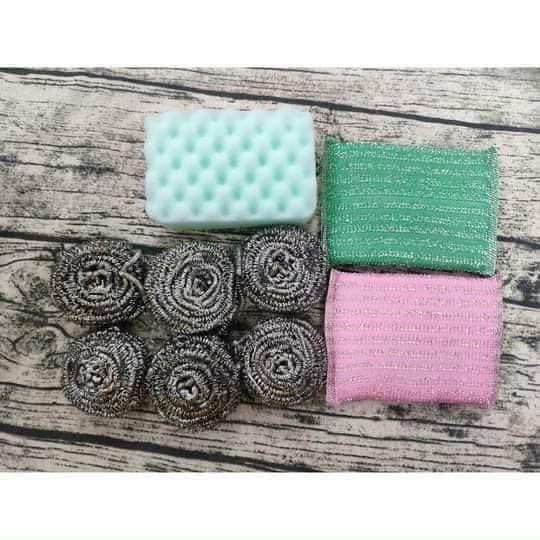 Set gồm 6 miếng sợi inox bao lấy nhau, giúp vừa lau chùi vừa cọ rửa các vết bẩn bám dính trên xoong, nồi đồ dùng nhà bếp và 3 miếng rửa bát tạo bọt giúp bạn rửa sạch các vật dụng dễ dàng và tiết kiệm.Vô cùng tiện lợi và tiết kiệm,dùng được rất nhiều thời gian luôn ạ.