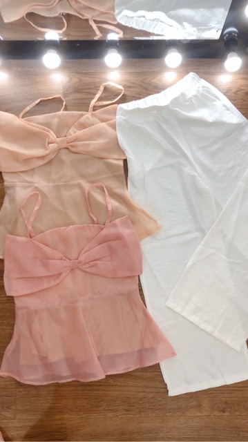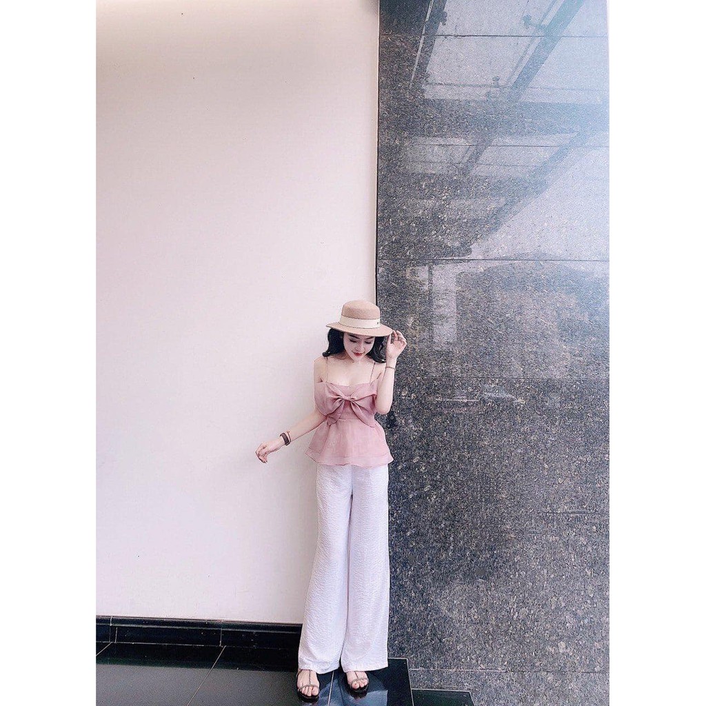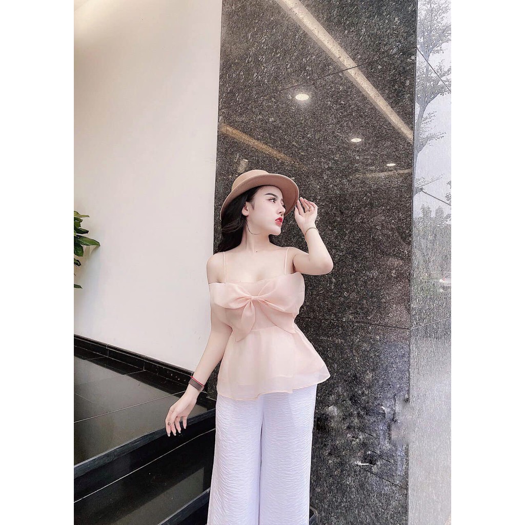 Set áo nơ to hai dây + quần suông trắng cao cấpsẵn sll 2 màu: Hồng - Be