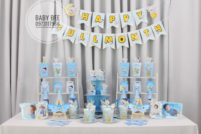 Set bàn tiệc đầy tháng dành cho các bé sinh năm tý ( chuột). Có 2 màu cho bố mẹ lựa chọn: xanh, hồngSet để bàn bao gồm: