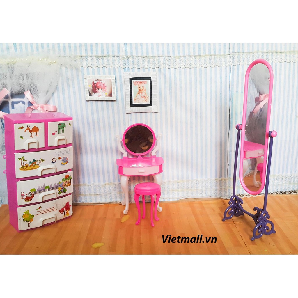 Set bàn trang điểm gương tròn phụ kiện búp bê