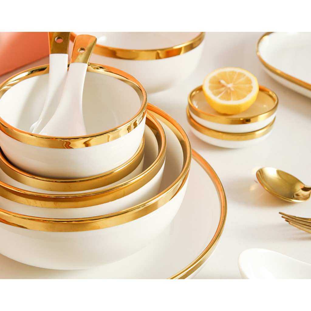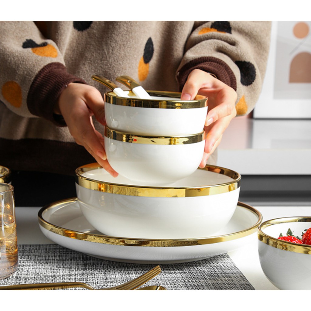 + Bộ bát đĩa được thiết kế sang trọng, hiện đại cùng màu sắc trang nhã, viền mạ vàng nổi bật chắc chắn sẽ tạo thêm sự trang trọng, lịch thiệp cho bàn ăn