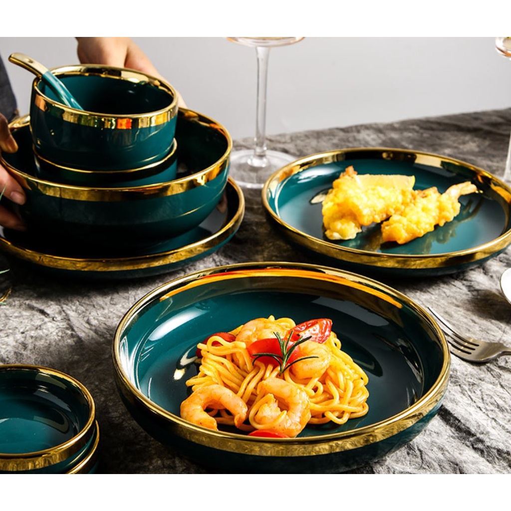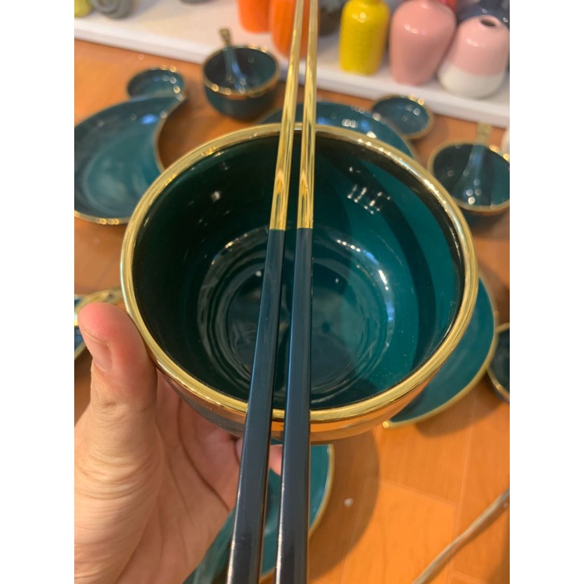 Nhà cửa & Đời sống > Bộ đồ bàn ăn > Tô || set bát 26 món cao cấp bán lẻ. bát con, thìa sứ xanh cổ vịt cao cấp bán lẻ. bát đĩa cao cấp. bán xanh viền vàng.Còn hàng