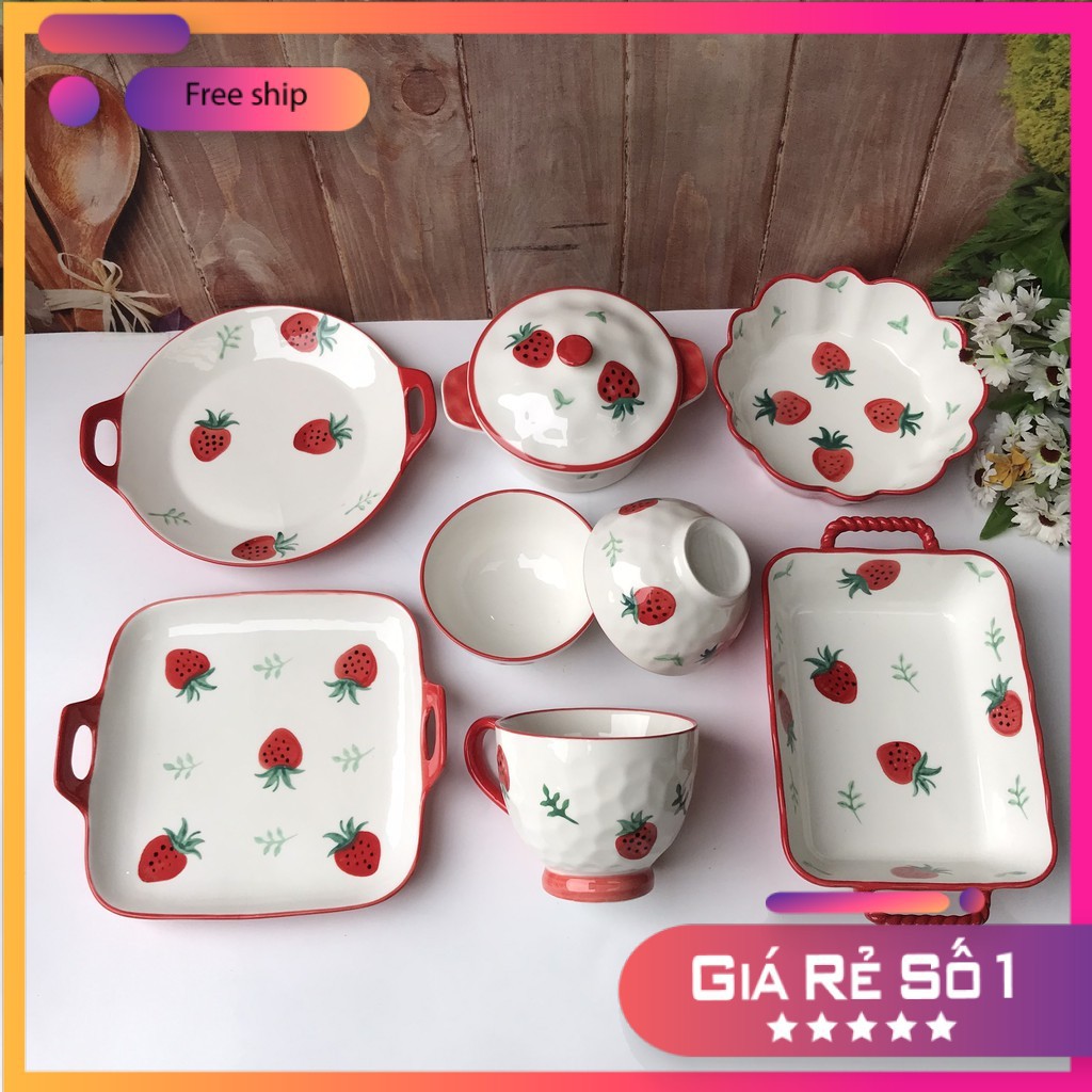 Nhà cửa & Đời sống > Bộ đồ bàn ăn > Dĩa || Set Bát Đĩa DÂU TÂY Bát đĩa ăn cơm ăn mì, decor bàn ăn dễ thươngCòn hàng