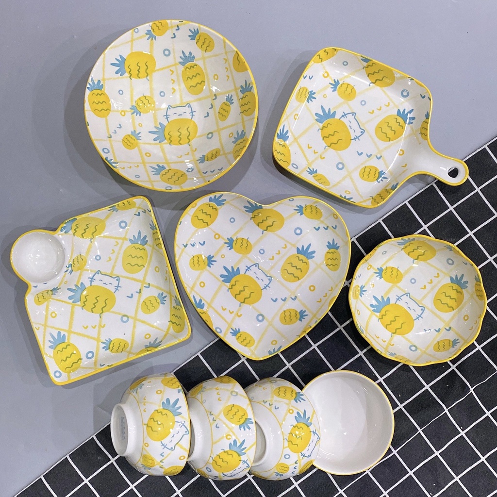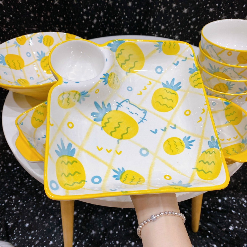 Sét bát đĩa gốm sứ decor siêu đáng yêu bộ dứa mèo vàng sét 11 món