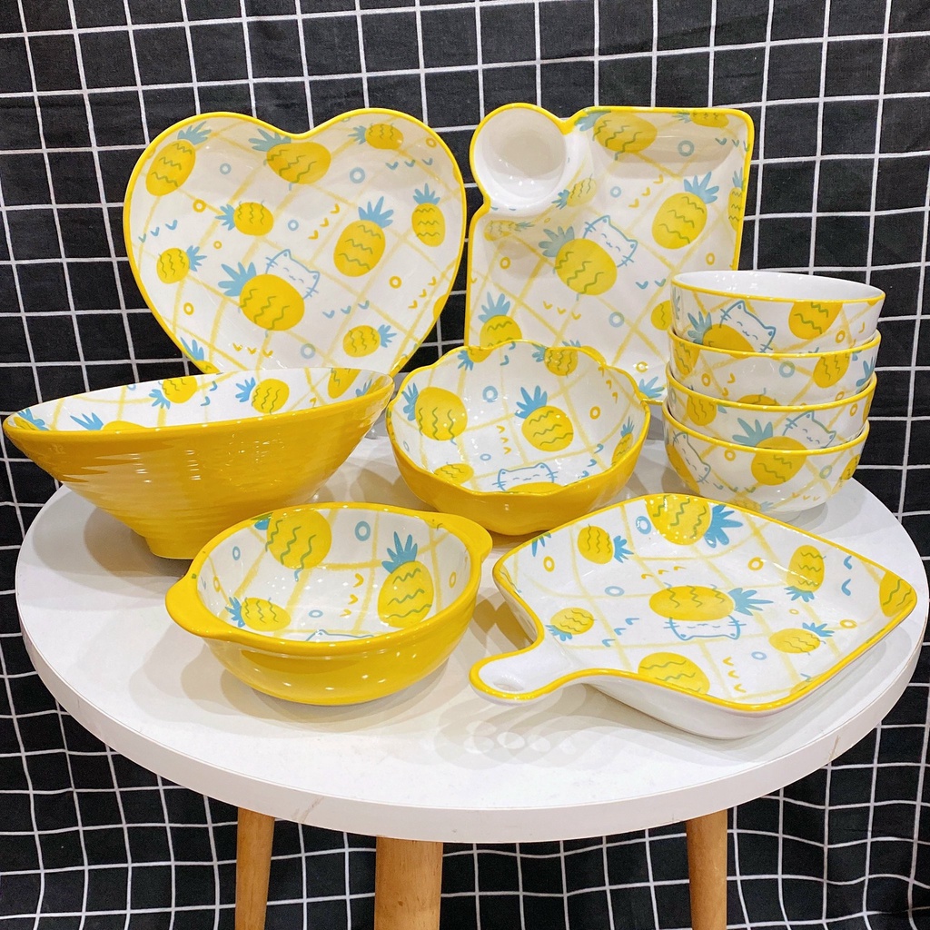 Giới thiệu Sét bát đĩa gốm sứ decor siêu đáng yêu bộ dứa mèo vàng sét 11 món