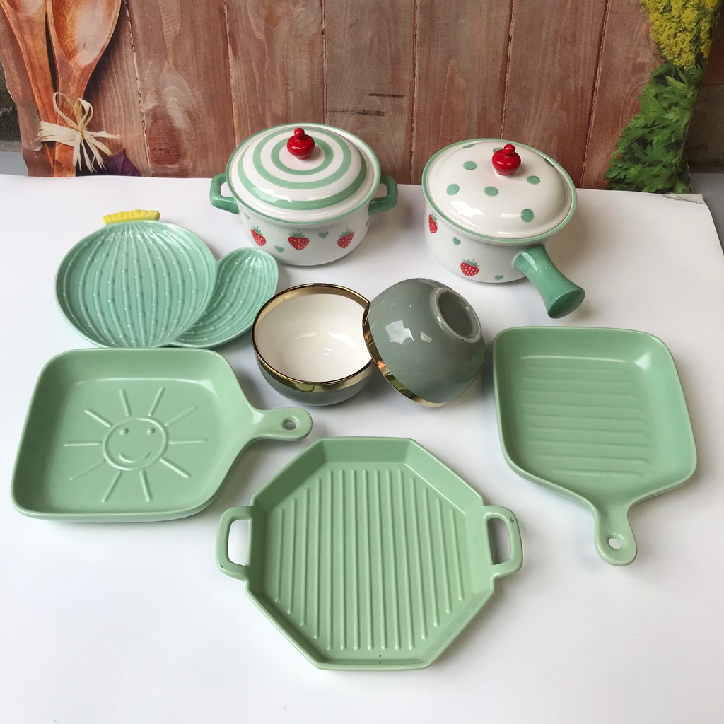 - Set bát đĩa có đầy đủ các món từ bát sứ, tô sứ, đĩa sứ, chảo sứ, bát ăn dặm, khay nướng bánh,... đều đủ cả