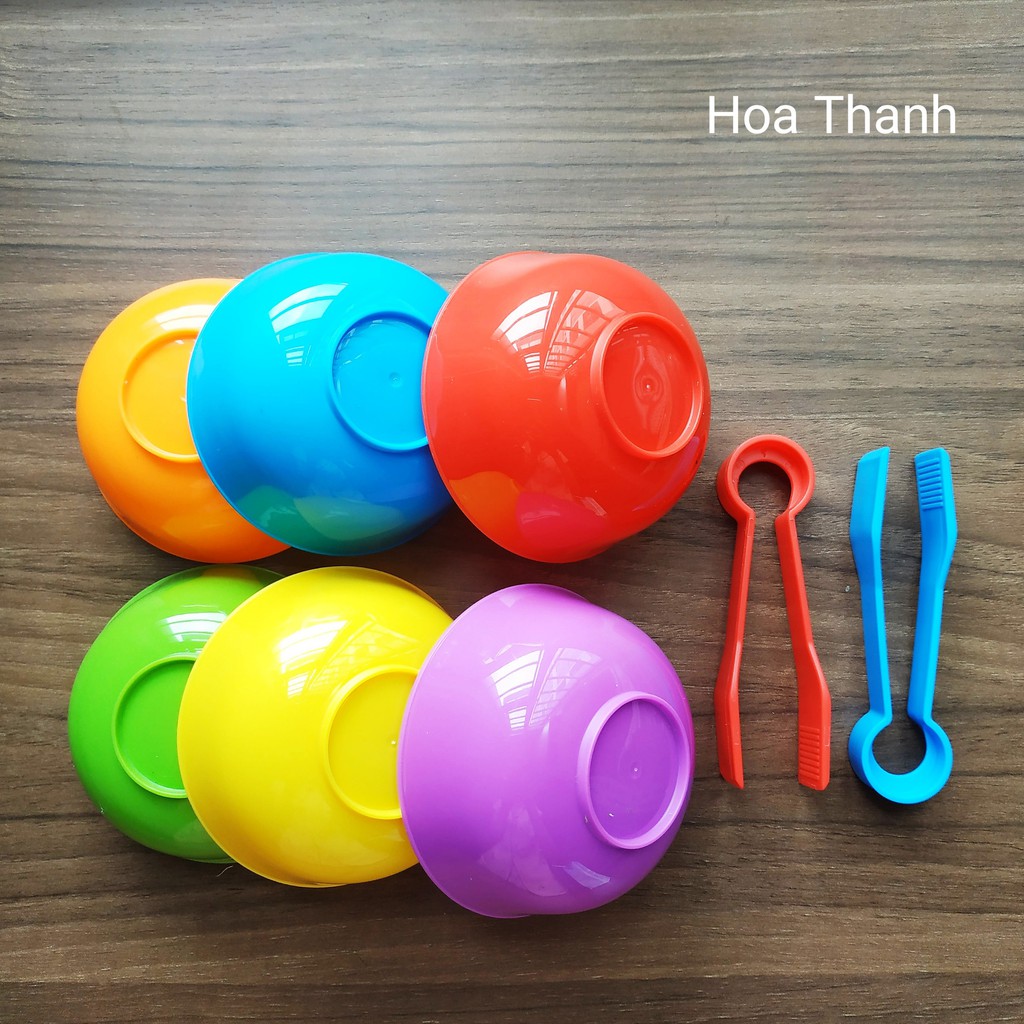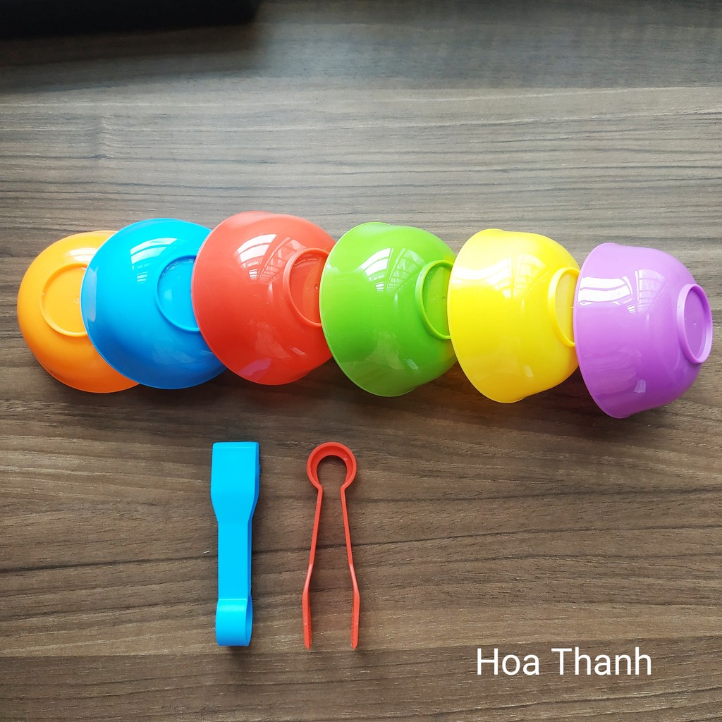 Set bát phân loại màu sắc gồm 6 bát 2 kẹpSet bát +hạt nhựa : gồm 6 bát, 2 kẹp, túi khoảng 100 hạt nhựa các màu