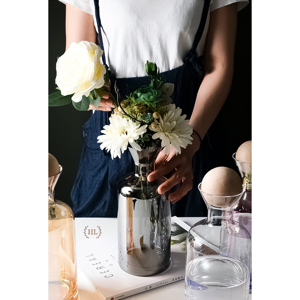 Bình được thiết kế kiểu sáng hình trụ như chai rượu phối kết hợp với nắp tròn gỗ mang đến cái nhìn mới lạ cho không gian sống của bạn
