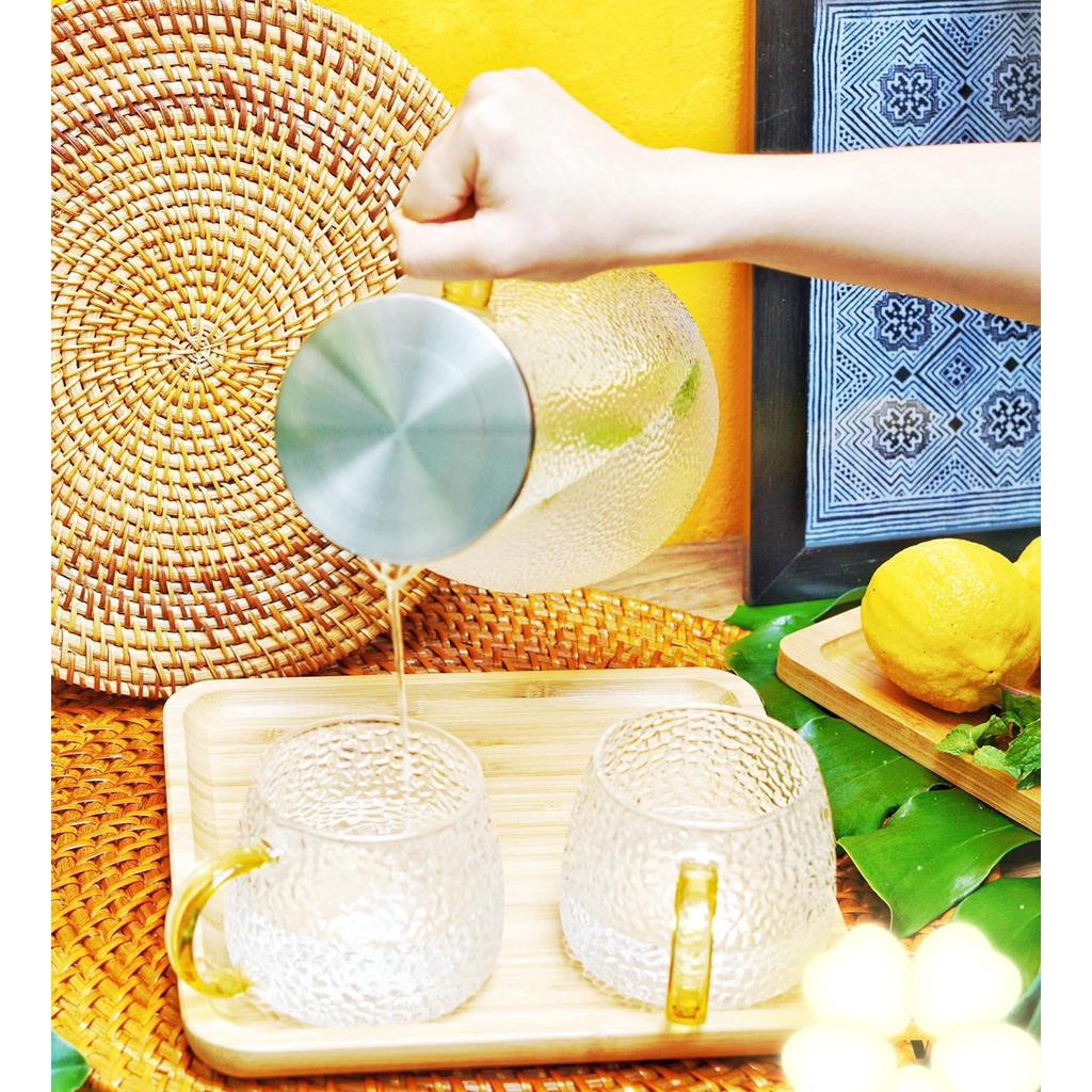 Giới thiệu Set bình đựng nước thủy tinh kèm 6 cốc vân sần thấp và khay gỗ