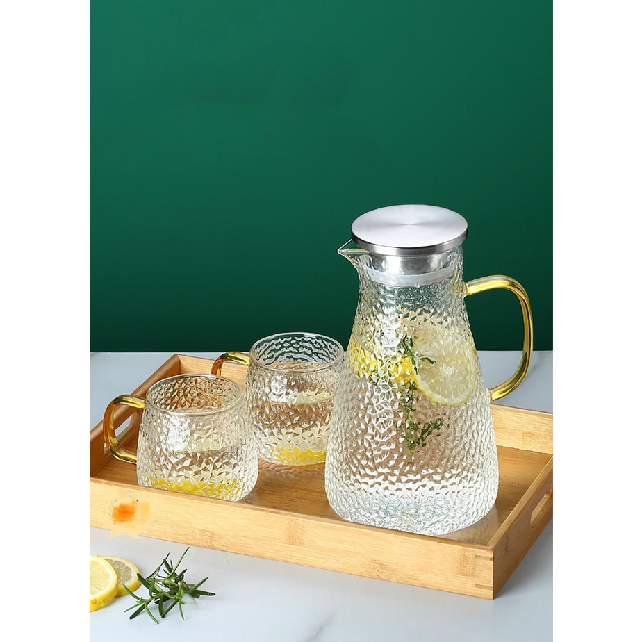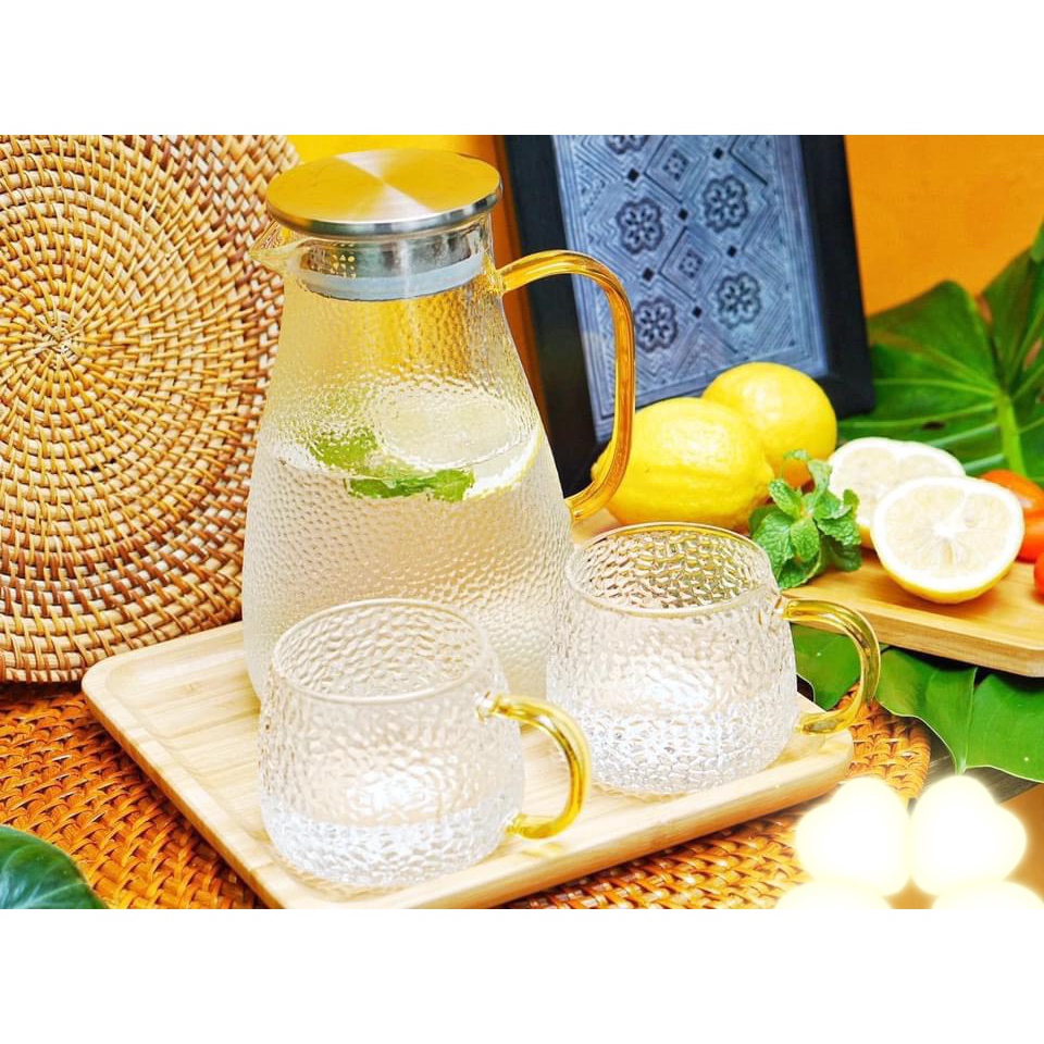 Nhà cửa & Đời sống > Bộ đồ bàn ăn > Bình nước & phụ kiện || Set bình đựng nước thủy tinh kèm 6 cốc vân sần thấp và khay gỗCòn hàng