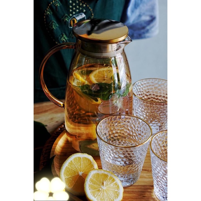1 - Bộ combo Gồm 1 bình thủy tinh vàng 1800ml & 6 cốc thủy tinh vân sần viền vàng dung tích 300ml + 1 khay gỗ tre. 499K