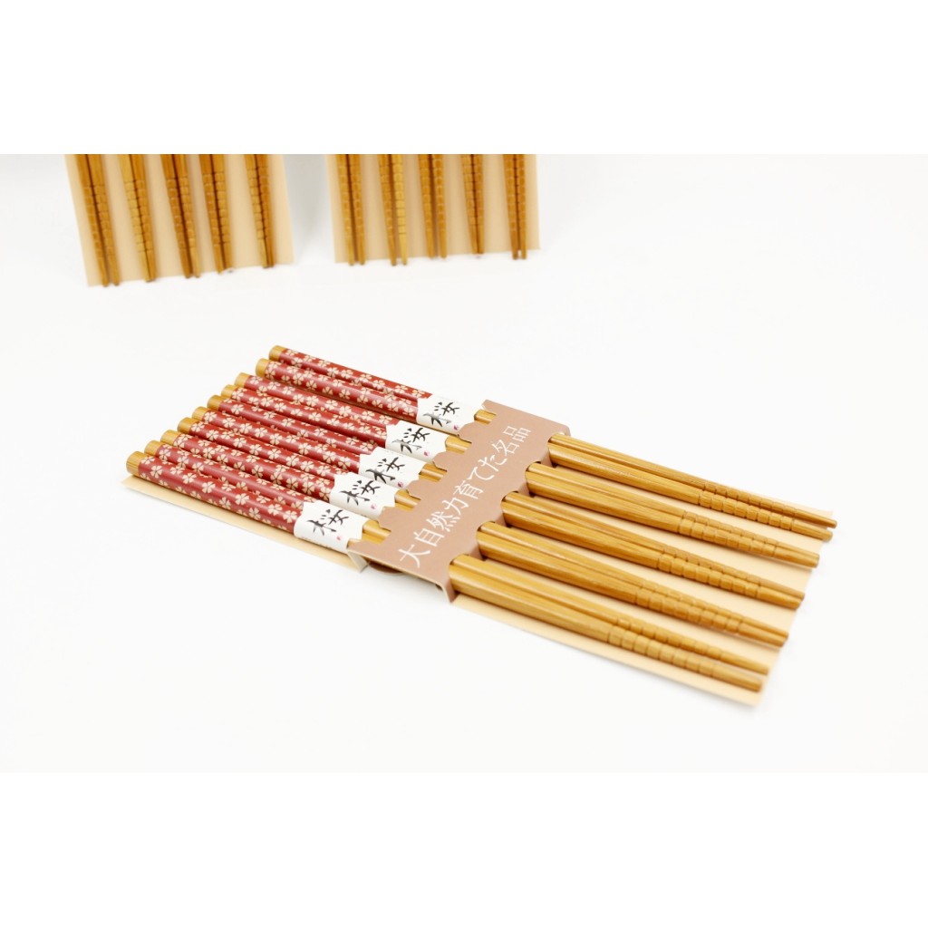 2/ Set 5 đôi đũa tre tự nhiên mẫu hoa màu đỏ - Nhật Bản