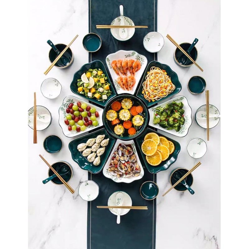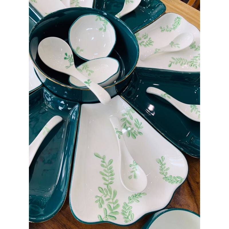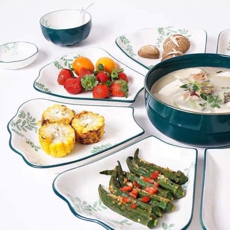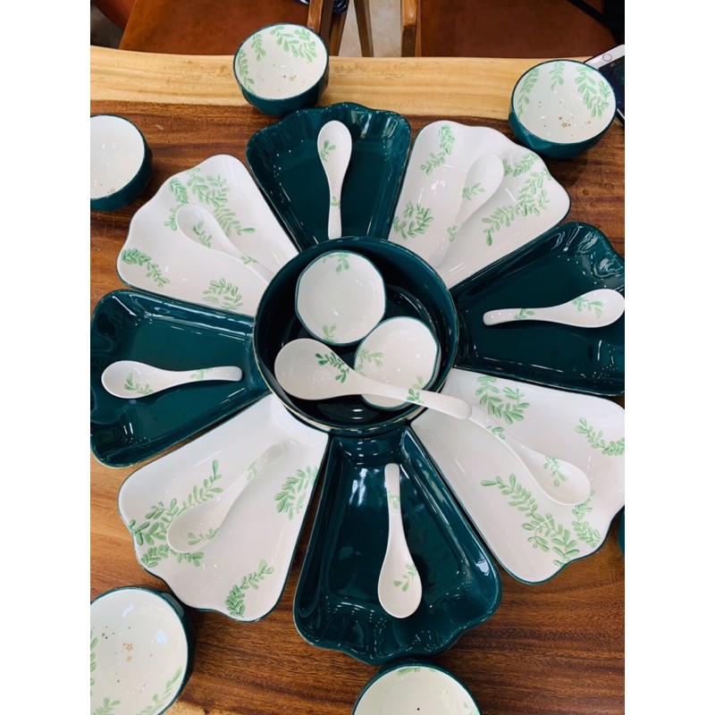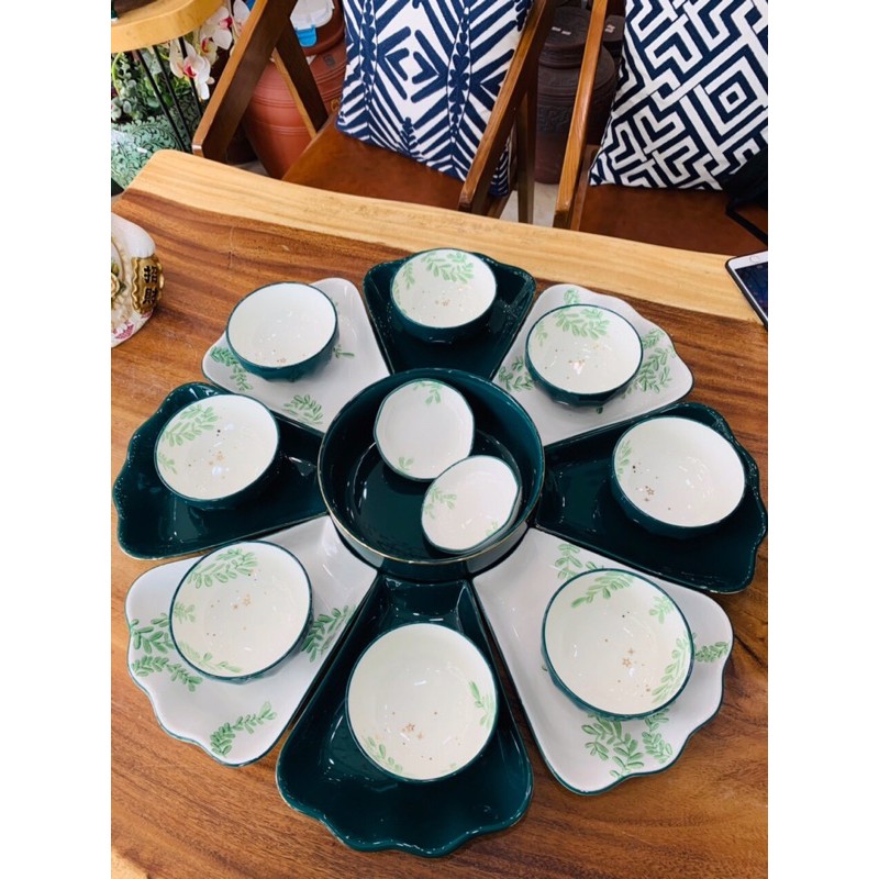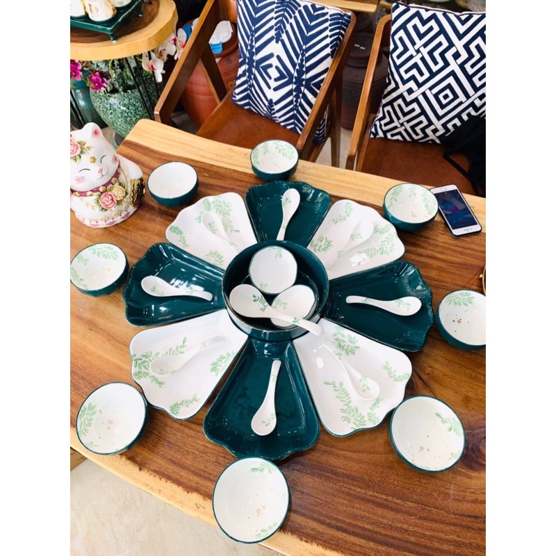 - Set 2 bao gồm: 01 bát tô, 08 đĩa cánh hoa, 01 đĩa muối, 01 bát mắm, 8 bát con, 8 thìa , 1 muôi