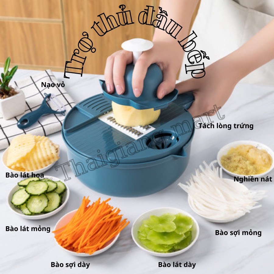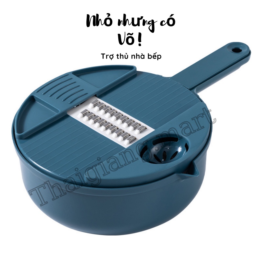 - Sét / bộ nạo bào rau củ đa năng 9 in 1 với nhiều chức năng: Thau, rổ, nghiền gừng tỏi, lược trứng, thái lát, bào sợi to nhỏ, bào khoanh..