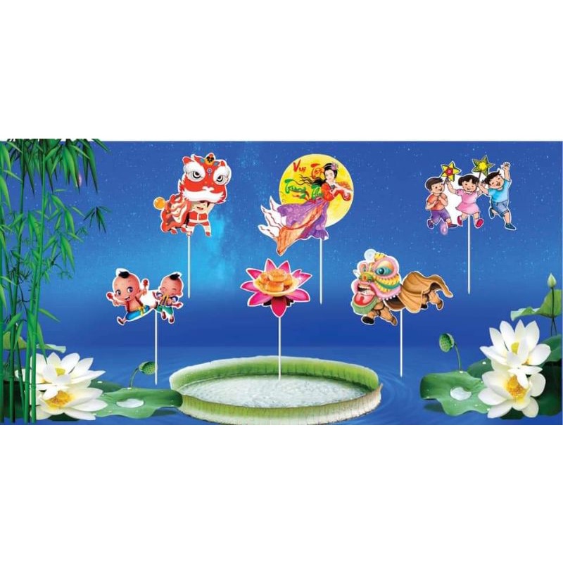 Set cắm giấy vui tết trung thu trang trí bánh kem, bánh sinh nhật, bánh gato.- Bộ sản phẩm gồm: 6 que cắm như hình, dễ dàng để các tiệm sáng tạo ra những chiếc bánh ưng ý khách trong lễ Trung thu sắp tơi