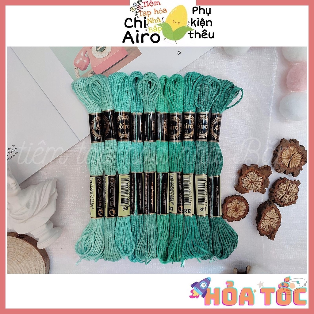 Set Chỉ Airo Tông Xanh Ngọc các con chỉ được tiệm nhà Bắp chọn và mix, xếp theo nhóm từng tông màu xanh thông dụng nhất.