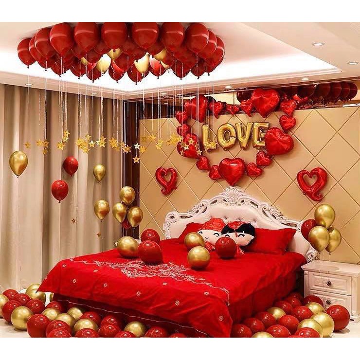 + Bộ chữ bong bóng Love màu vàng+ 5 bong bóng trái tim đỏ 40cm