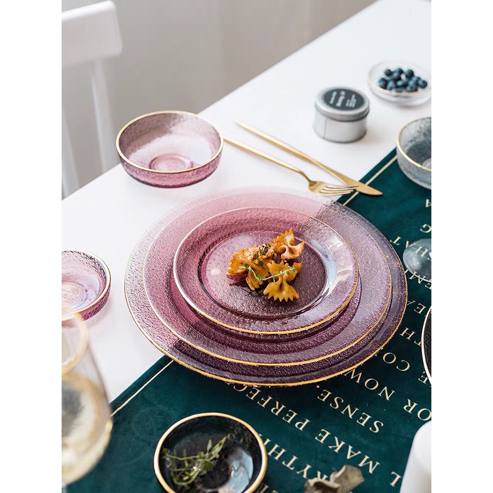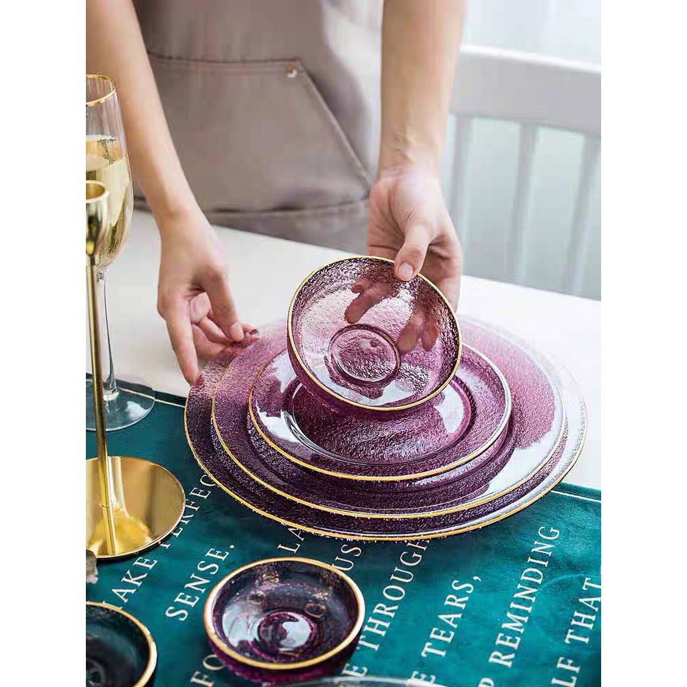Set đĩa và tô thủy tinh nhiều màu sắc viền vàng, để hoa quả,salad,bánh kẹo, mới lạ phù hợp cho mọi gia đình