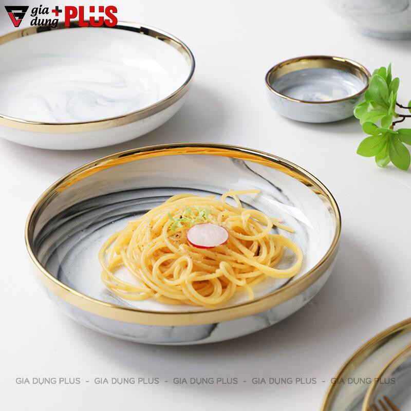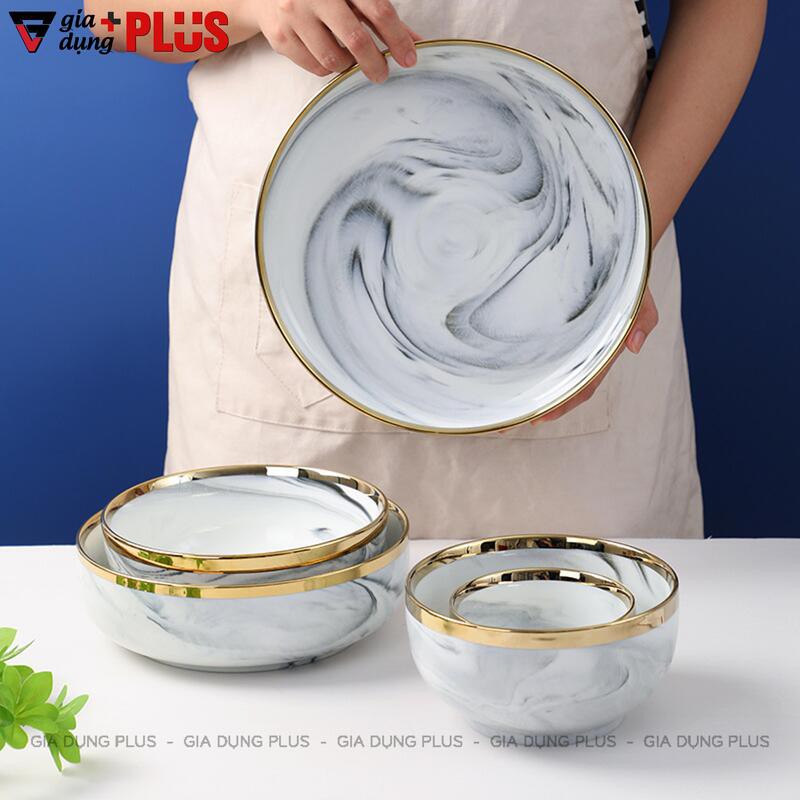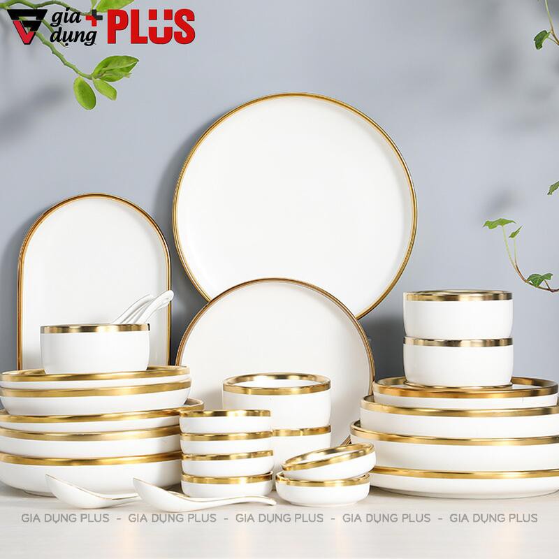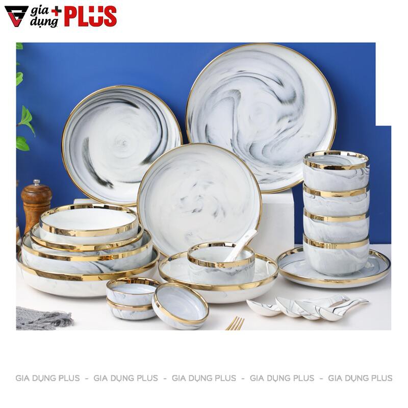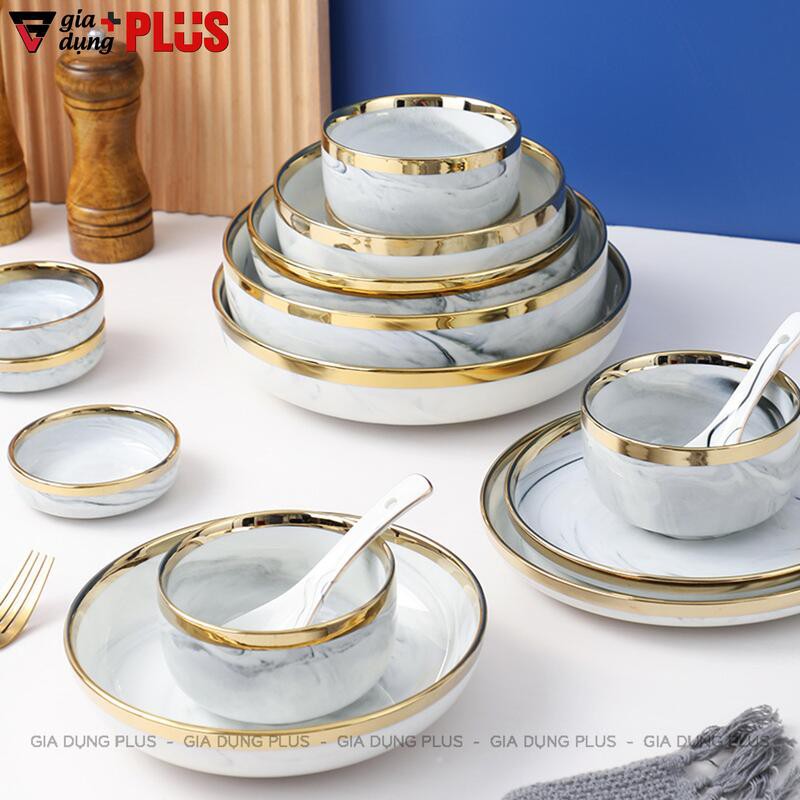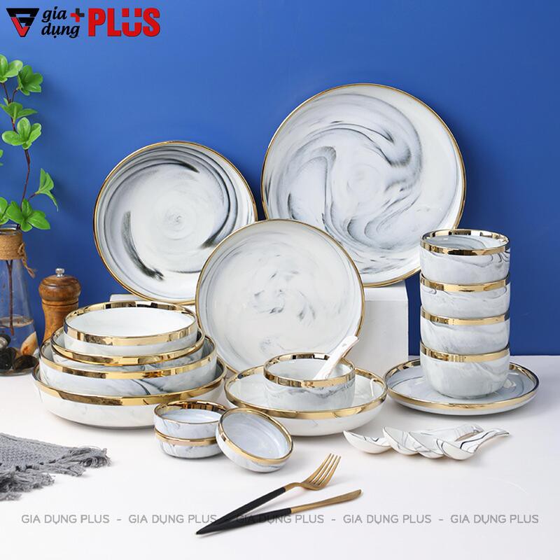 Nhà cửa & Đời sống > Bộ đồ bàn ăn > Dĩa || Set đồ ăn sứ màu trắng vân đá, viền vàng phong cách Bắc Âu (kèm hộp quà)Còn hàng