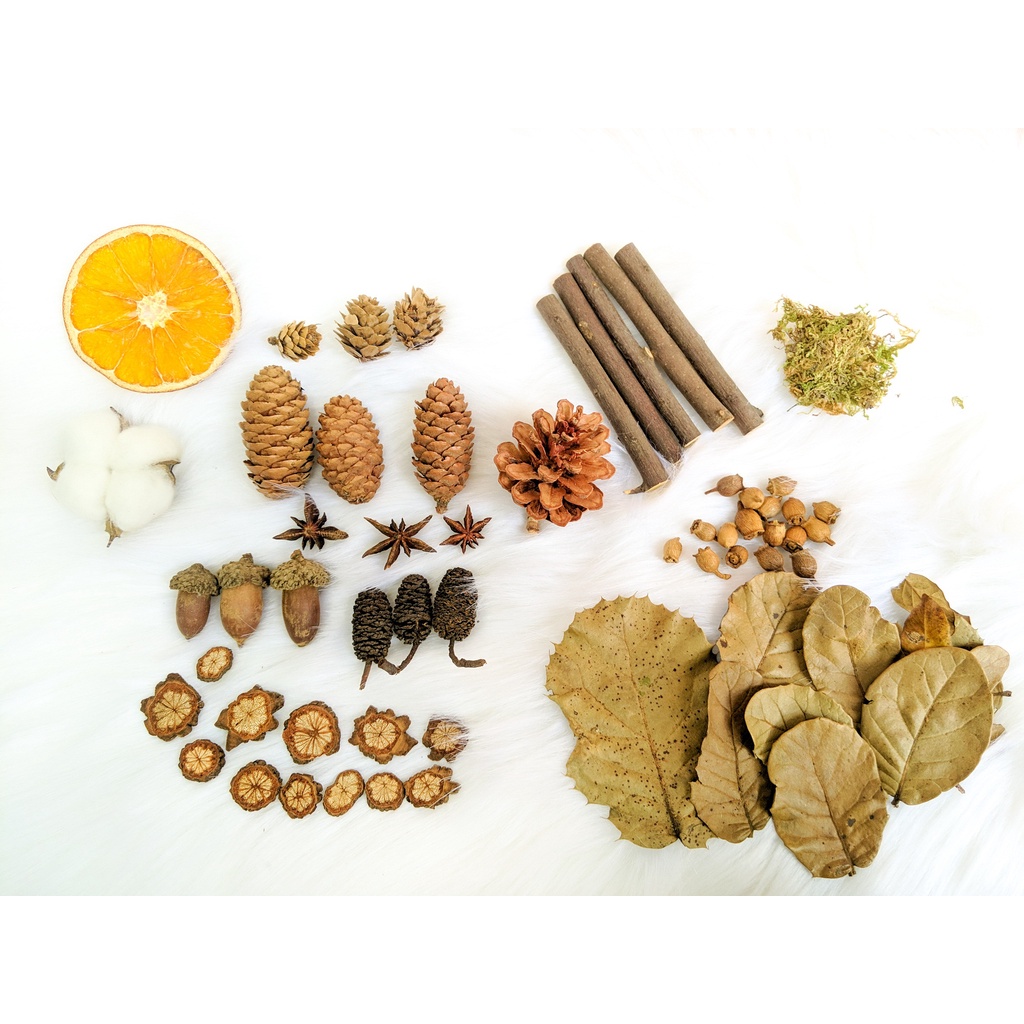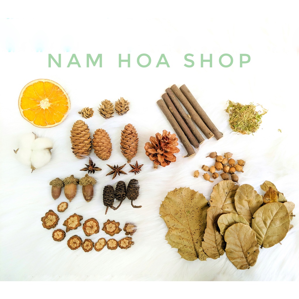 - Sản phẩm được gom trong 1 bọc chứa các loại phụ kiện khác nhau như: Các loại hạt thông, Lá khô, Rêu khô, Cây khô, cành khô…